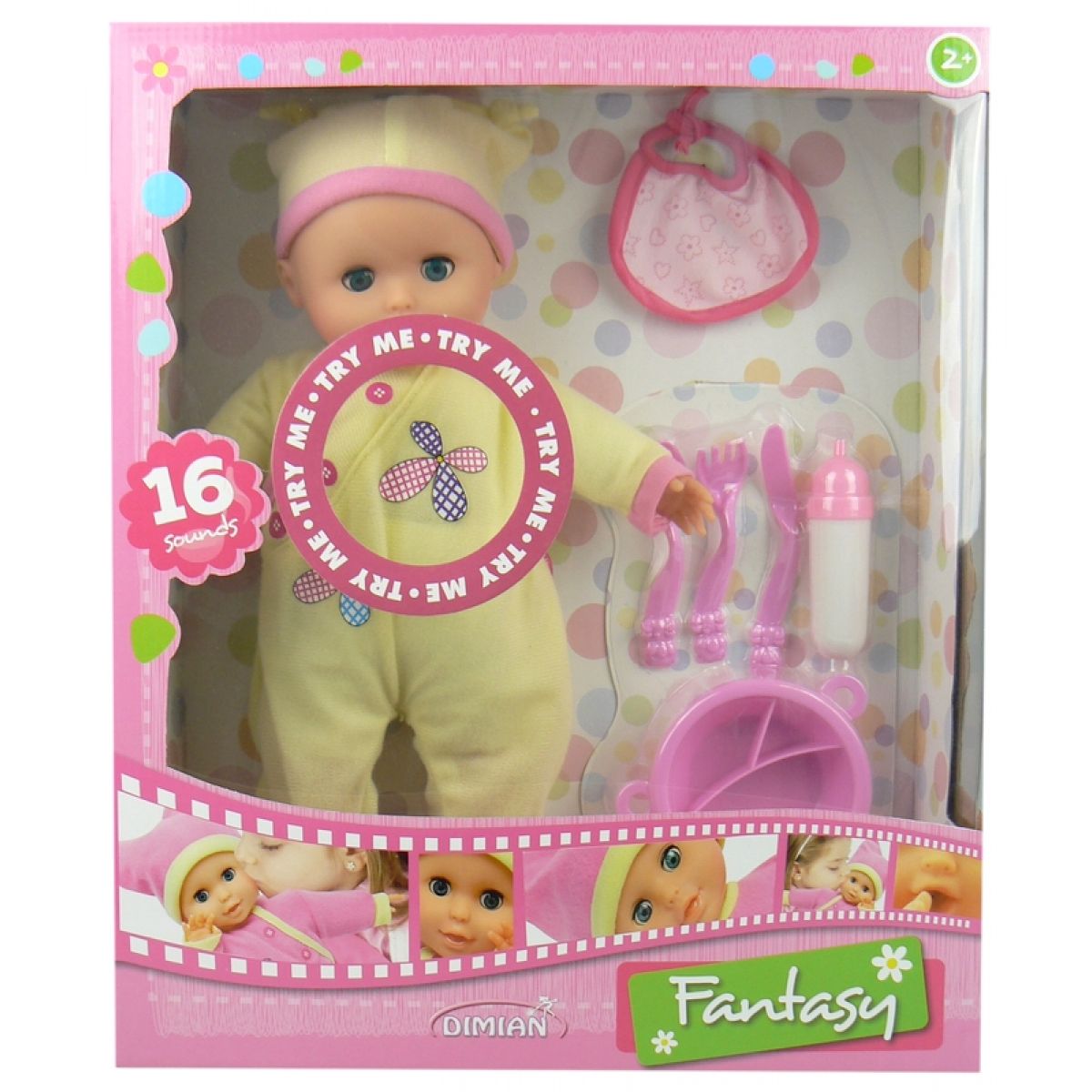 Panenka Fantasy s měkkým tělíčkem ve žlutém oblečku čeká na holčičky od 2 let, které chtějí mít mluvicí miminko, o které se budou starat. Panenka umí mrkat, říkat máma a táta a po stisknutí bříška vydávat dalších 16 zvuků.