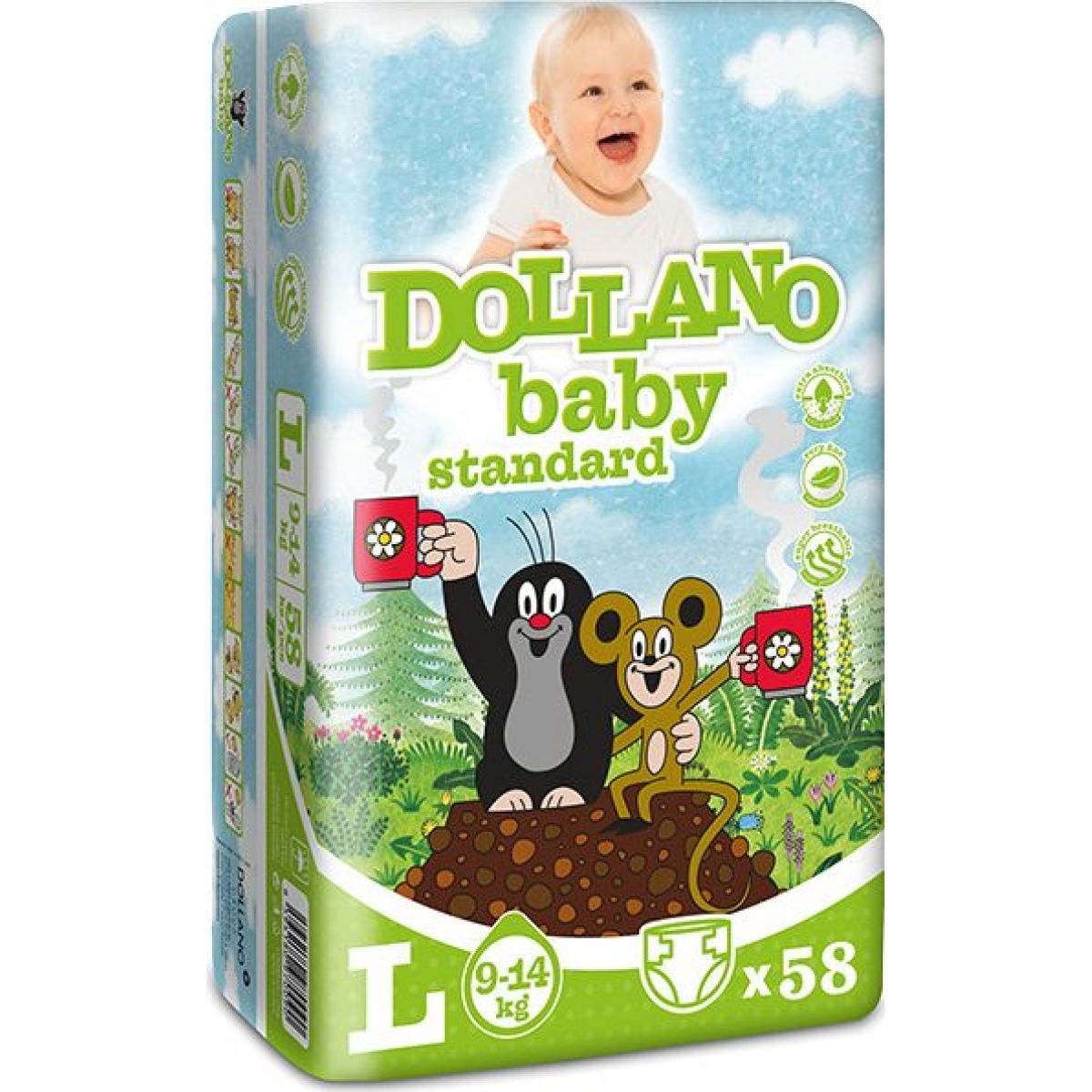 DOLLANO Baby Standart, veľkosť L, 58ks –jednorázové plienkyPopis:Moje prvé nohavičky:Vaše dieťatko sa bude cítiť spokojne ako v rozprávke, ktorú muprinesú Krtkova nohavičky.Super absorpčné, elastické, ochrana proti úniku. Plienkys krtkom majú savosť 400 ml.Boli vyvinuté odborníkmi spoločnosti DOLLANO a vyrobené za použitianajmodernejších technológií. Všetko je kontrolované aopakovane testované v európskych laboratóriách.Plienky DOLLANO majú výborné savé vlastnosti, najmävďaka prítomnosti absorbentu SAP vydržia vaše dieťatko až12 hodín bez prebalenie.Zadné časti plienok nechýba pružný okraj, ktorýzabraňuje pretečeniu. Plienky sú extra jemné a vysoko priedušné, súčasneaj veľmi ekologické, pretože sú vyrábané bez latexu a ďalšíchškodlivých látok.Najdôležitejšie informácií pre vás je, že plienky DOLLANO nie súbielené chlórom, nie sú parfumované, a tým sú výrazne šetrnejšiek pokožke vášho dieťatka.Výrobky nie sú bielené chlórom, nie je používanýlatex, sú extra savé, veľmi jemné a vysoko priedušné.Rozmer balenia a špecifikácie:Deti nikdy nenechávajte bez dozoru. Plastový obal skladujte mimo dosahudetí, zabránite tak možnému nebezpečenstvu udusenia. Najvyššiespotrebovať do dátumu na obale.