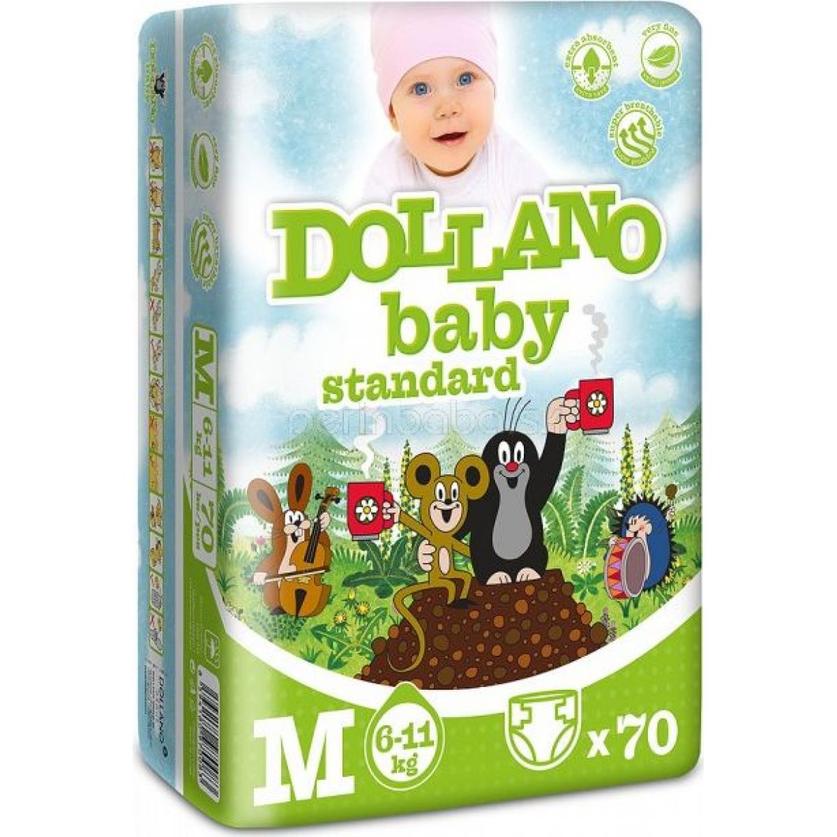 DOLLANO Baby Standart, veľkosť M, (6–11 kg)70ks – jednorázové plienkyPopis:Moje prvé nohavičky:Vaše dieťatko sa bude cítiť spokojne ako v rozprávke, ktorú muprinesú Krtkova nohavičky.Super absorpčné, elastické, ochrana proti úniku. Plienkys krtkom majú savosť 300 ml.Boli vyvinuté odborníkmi spoločnosti DOLLANO a vyrobené za použitianajmodernejších technológií. Všetko je kontrolované aopakovane testované v európskych laboratóriách.Plienky DOLLANO majú výborné savé vlastnosti, najmävďaka prítomnosti absorbentu SAP vydržia vaše dieťatko až12 hodín bez prebalenie.Zadné časti plienok nechýba pružný okraj, ktorýzabraňuje pretečeniu. Plienky sú extra jemné a vysoko priedušné, súčasneaj veľmi ekologické, pretože sú vyrábané bez latexu a ďalšíchškodlivých látok.Najdôležitejšie informácií pre vás je, že plienky DOLLANO nie súbielené chlórom, nie sú parfumované, a tým sú výrazne šetrnejšiek pokožke vášho dieťatka.Výrobky nie sú bielené chlórom, nie je používanýlatex, sú extra savé, veľmi jemné a vysoko priedušné.Rozmer balenia a špecifikácie:Deti nikdy nenechávajte bez dozoru. Plastový obal skladujte mimo dosahudetí, zabránite tak možnému nebezpečenstvu udusenia. Najvyššiespotrebovať do dátumu na obale.