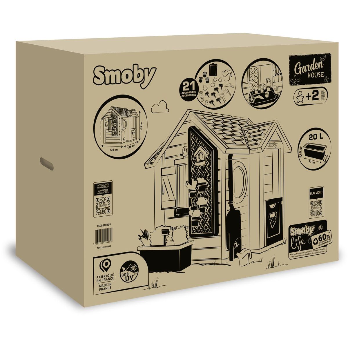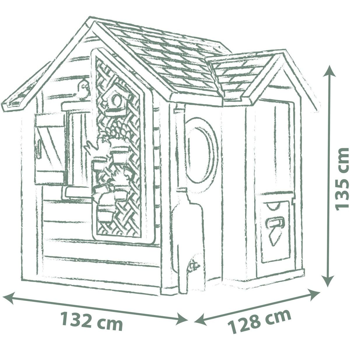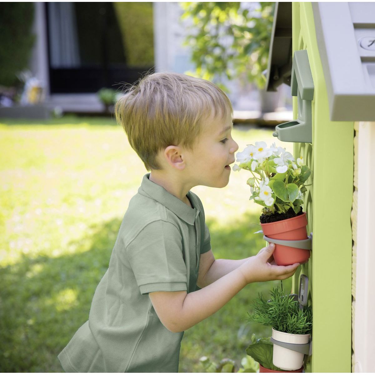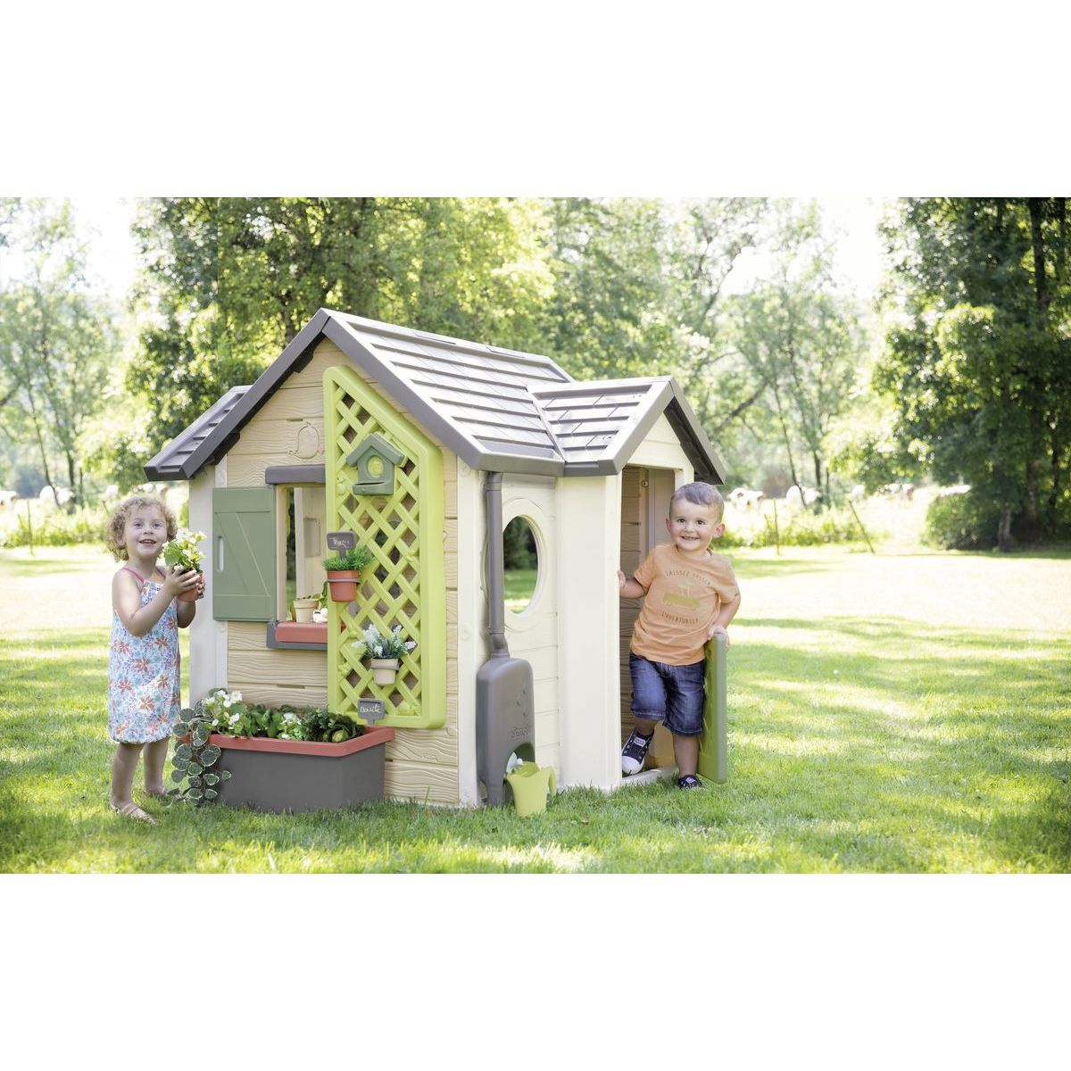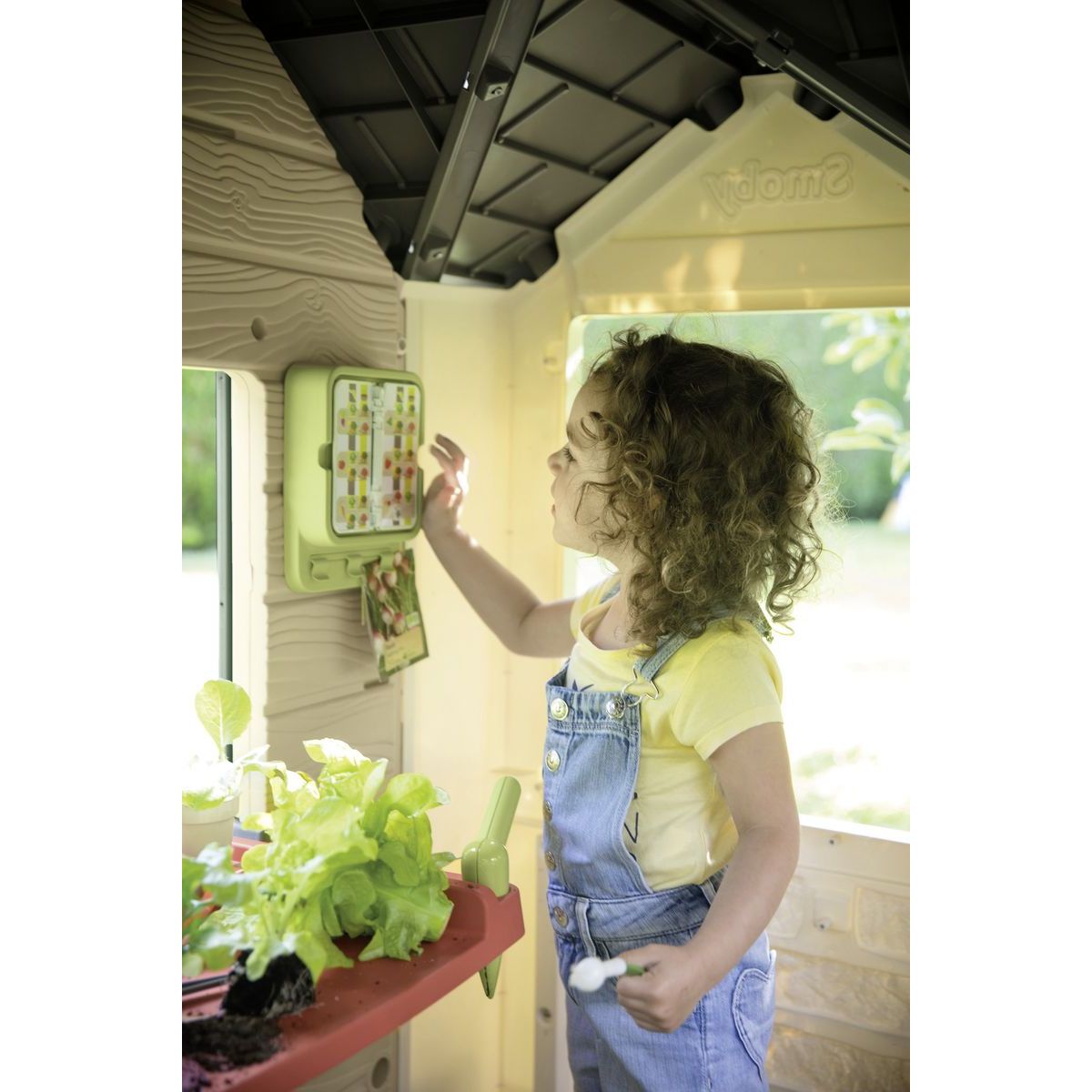 Tento detský domček je ako stvorený pre malých milovníkov prírody. Obsahuje veľký kvetináč, mriežku s kvetináčmi, kŕmidlo, odkvap s kanvičkou a ďalšie doplnky. Celkovo až 21 kusov príslušenstva podporuje kreatívnu hru na záhrade. Dvere majú výšku 46,3 cm od zeme, celkové rozmery domčeka sú 128 x 135 x 132 cm. Vyrobený je z odolného plastu s minimálne 60 % podielom recyklovaného materiálu. Možnosť rozšírenia o ďalšie komponenty ako kuchynka, zvonček či piknikový stôl.