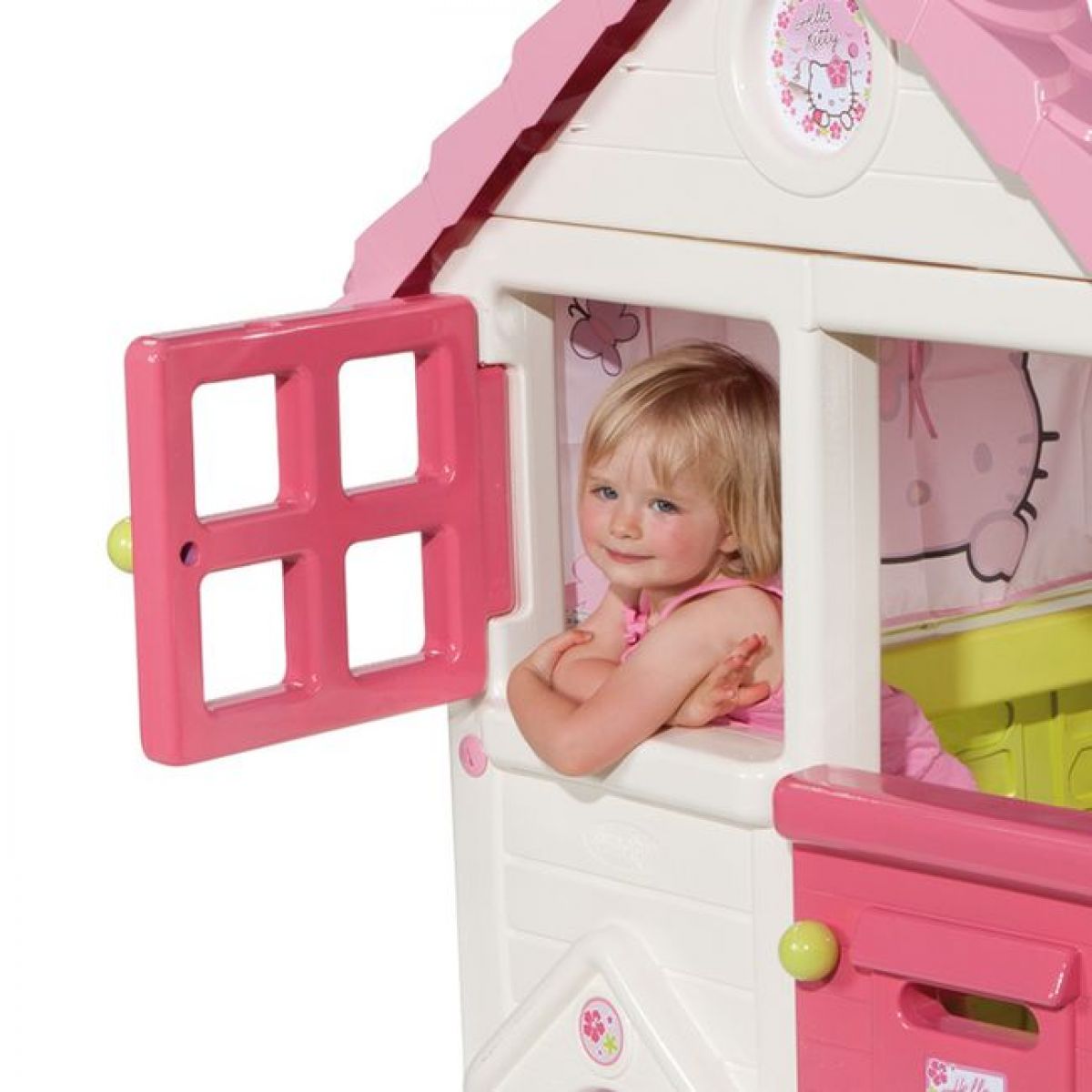 Domeček s motivem Hello Kitty je vybaven dvěma textilními závěsy, otevíracím oknem a malými dveřmi s poštovní schránkou.