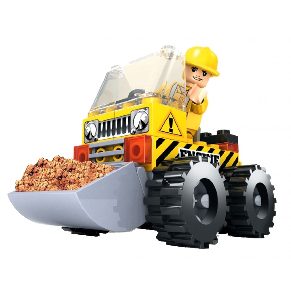 Žlutý bagr s velkými koly a přední nabírací lžící si děti mohou sestavit z 60 dílků. Jednotlivé barevné dílky jsou kompatibilní s dalšími stavebnicemi Dromader a tak s ostatními plastovými stavebnicemi.