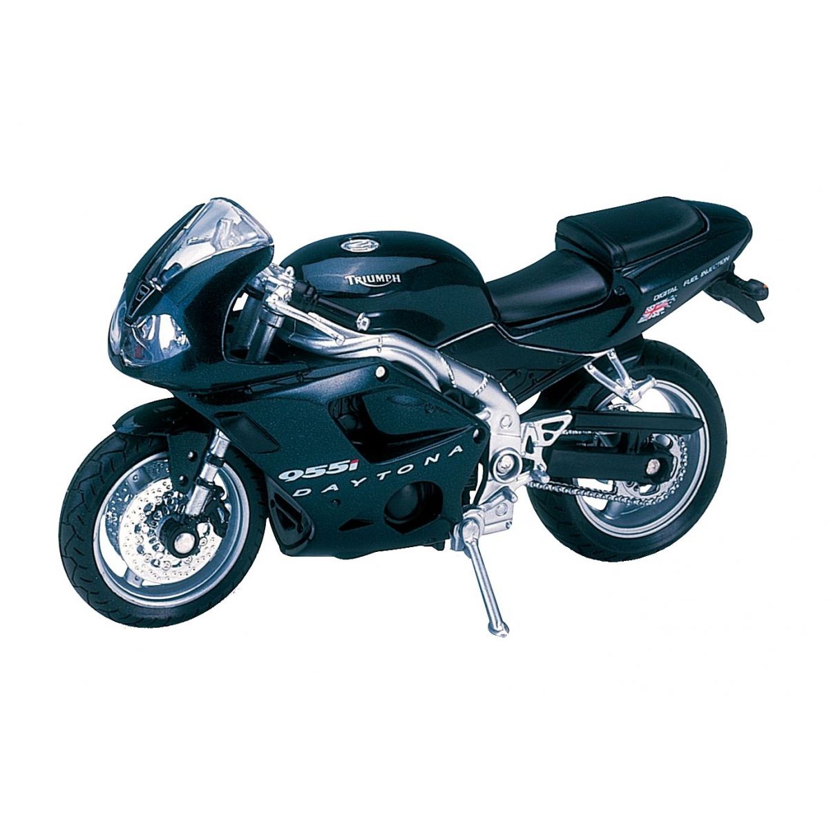 Triumph Daytona 955i je jeden z kovových modelů kolekce Welly, zpracovaných v měřítku 1:18. Motorka je zaparkovaná na plastovém podstavci.