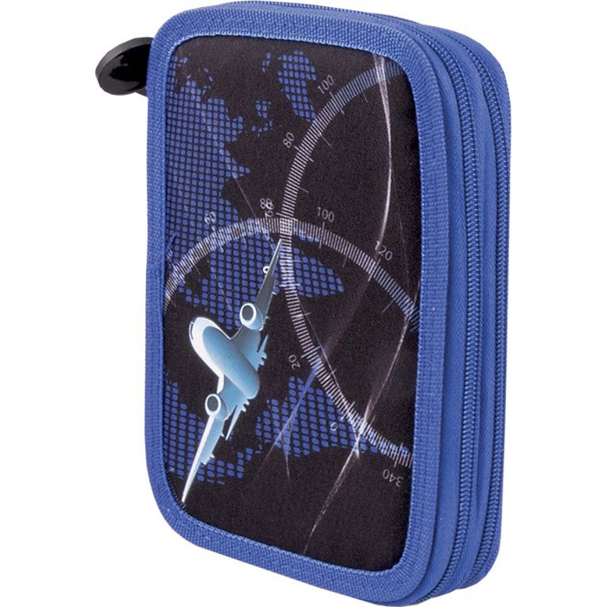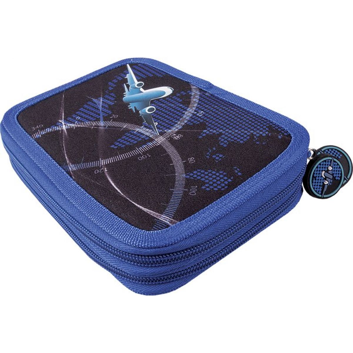 Dvoupatrový penál s motivem vzdušného prostoru nad mapou světa. Vnitřní část má šikovné členění, kde si školáci mohou umístnit psací a kreslící potřeby. Ty nejsou součástí penálu.