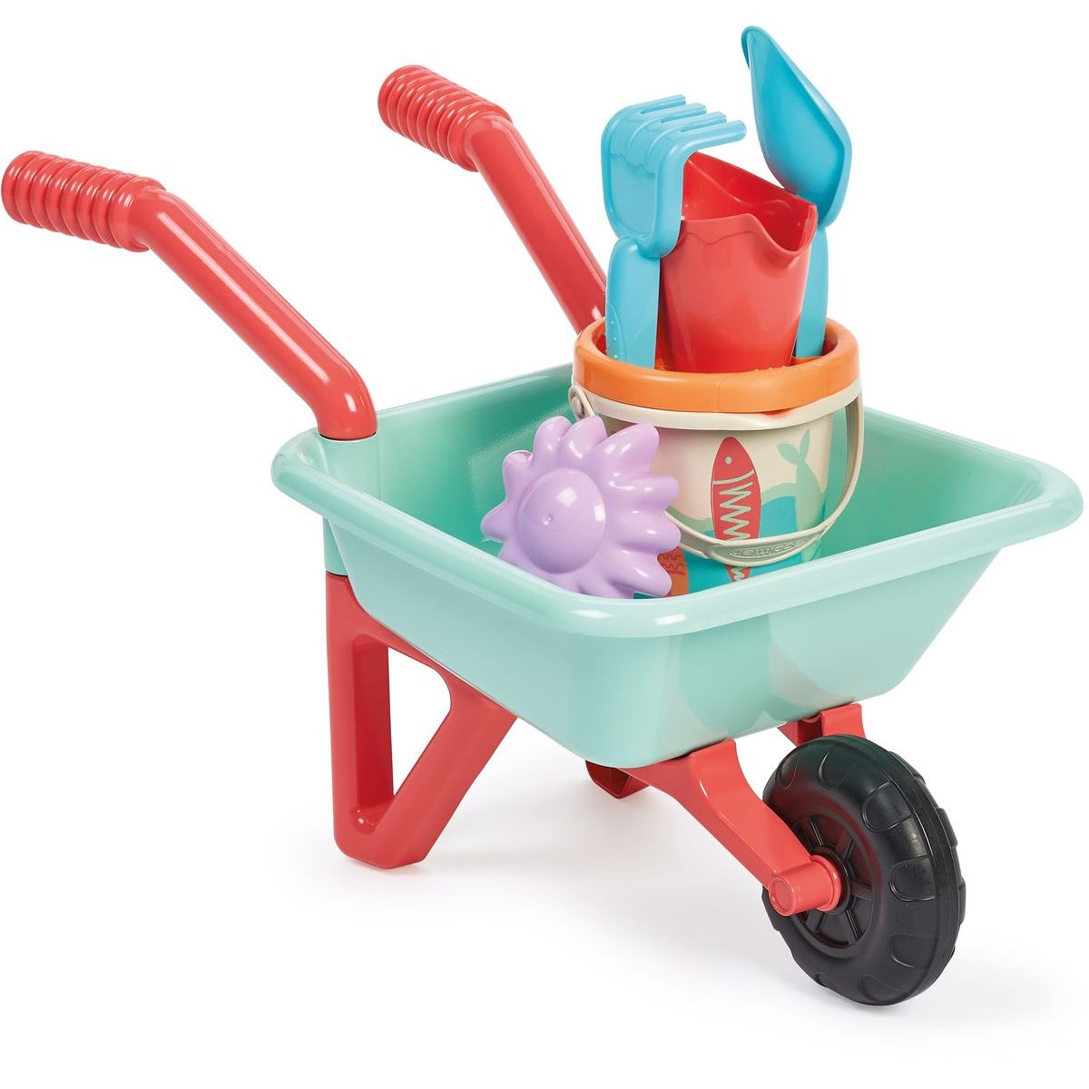Súčasťou sú vedierko s priemerom 12 cm, sitko, formička, hrabličky aj lopatka, ktoré spoločne umožňujú hranie v piesku alebo na záhrade. Ľahký a jednoduchý na používanie pomáha rozvíjať jemnú motoriku a tvorivosť detí počas ich hier vonku.