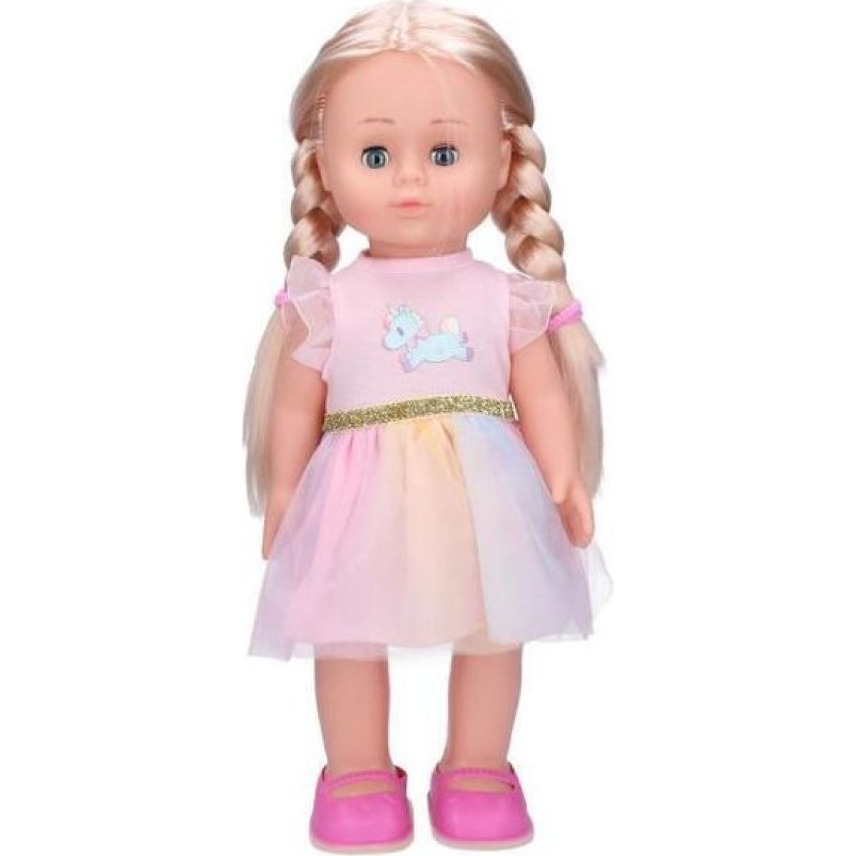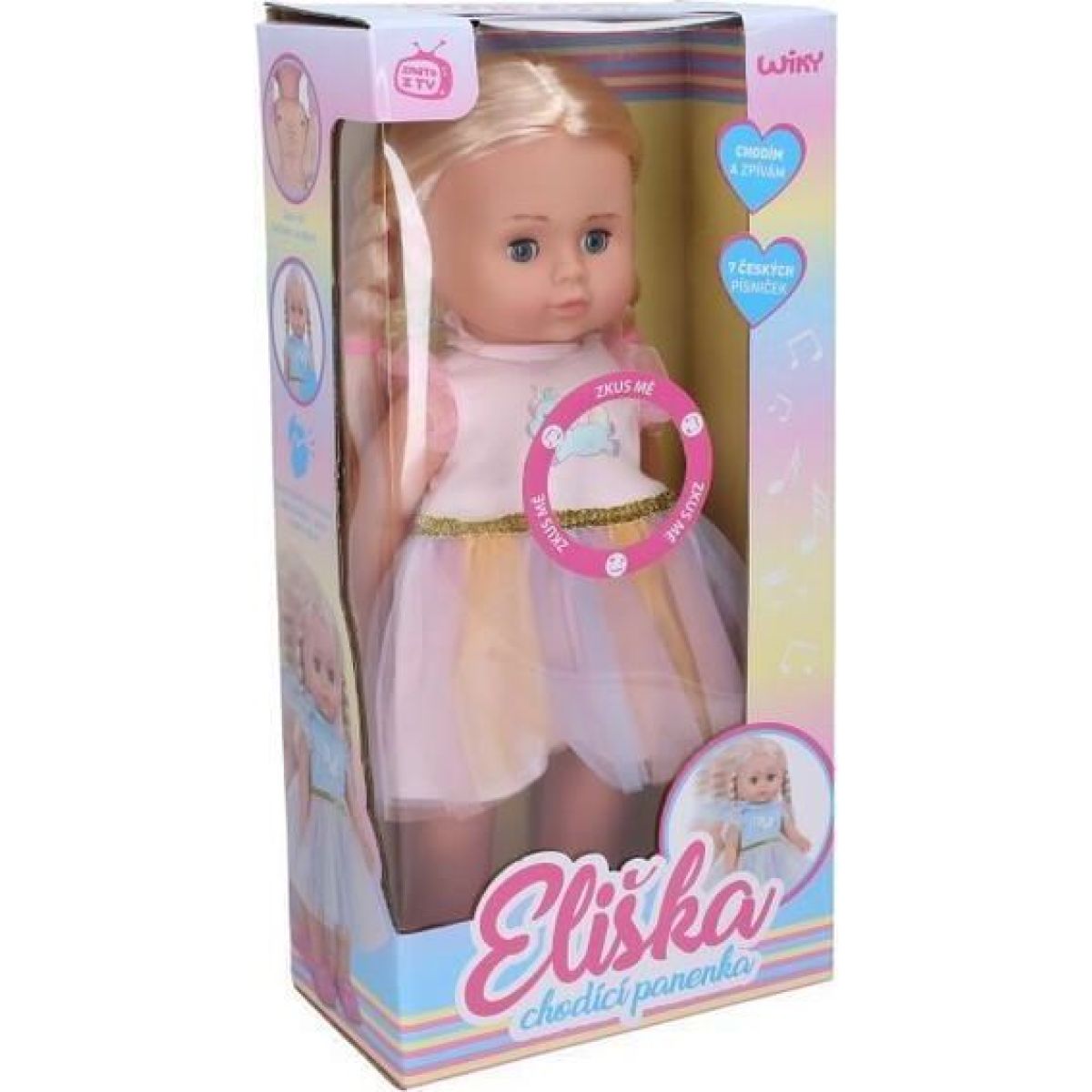 Bábika má dlhé blond vlásky sčesané do culíčky, je oblečená do šiat ladených do ružovej farby. Bábika spieva v českom jazyku.