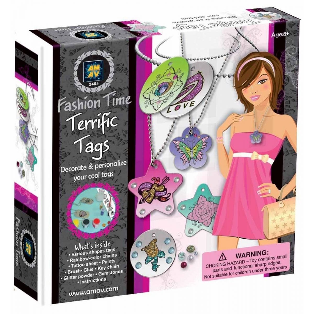 Balení obsahuje různě tvarované přívěsky, duhové řetízky, tetování, barvy, štěteček, lepidlo, kovové zapínání, třpytivý prášek, kamínky a návod.
