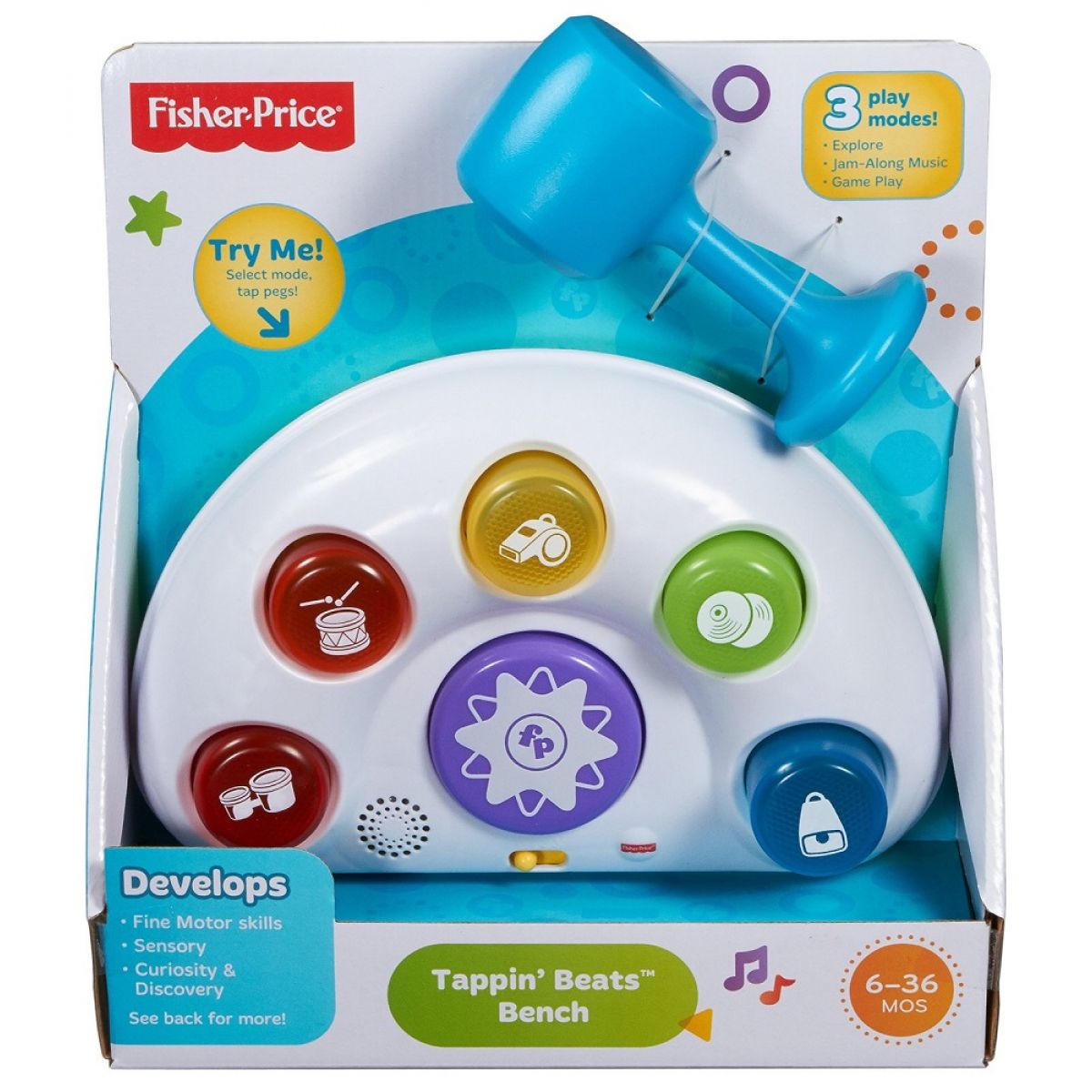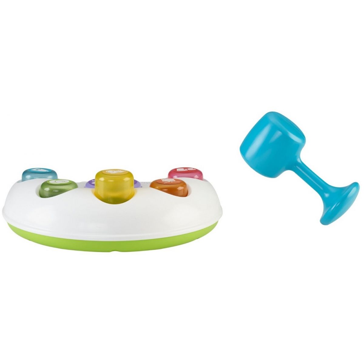Tolik hudby, světla a různých zvuků! To všechno pomocí snadno uchopitelného kladívka! Stačí jen uhodit do některého z pěti kolíků! Když dítko stiskne fialové tlačítko, kolíky vyskočí zpět a zábavná hra může pokračovat! Hra obsahuje tři úrovně pro děti různých věkových skupin. Úroveň 1 „Prozkoumávání, úroveň 2 „Jamování” a úroveň 3 „Hra“. Uchopení kladívka a práce s ním posiluje jemné motorické dovednosti a koordinuje pohyb očí a rukou. Hra přirozenou formou seznamuje dítko s příčinou a důsledkem.