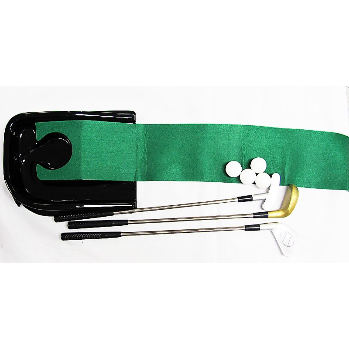 Sada golfových tyčí s rôznym zakončením a plastovou časťou dráhy s jamkou pre potrebný tréning.