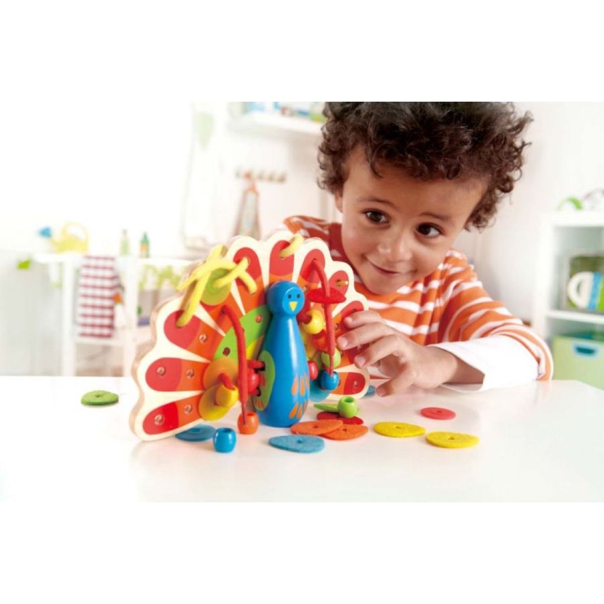 Zábavné šnurovanie a prevliekanie. Šnúrky sa môžu meniť. Precvičovanie jemnej motoriky a predstavivosti.