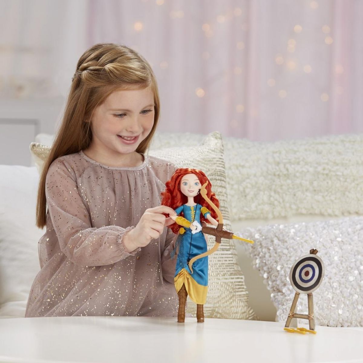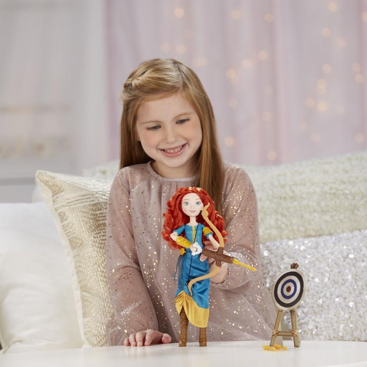 Dobrodružná Merida je oblečená v poľovníckej róbe a nechýba jej ani luk. Pomôž jej napnúť luk, vystreliť šíp a zasiahnuť terč. Dievčatká si tak môžu užiť s odvážnou princeznou Merida veľa zábavy pri vytváraní zábavných scénok. • Súprava s dobrodružnou princeznou s poľovníckou výbavou. • Súčasťou balenia je aj terč, na ktorom princezná trénuje lepšie streľbu. • Vyrobené z nezávadného plastu. • Veľkosť balenia: 32 × 20 × 6 cm. • Vhodné pre deti od 3 rokov.