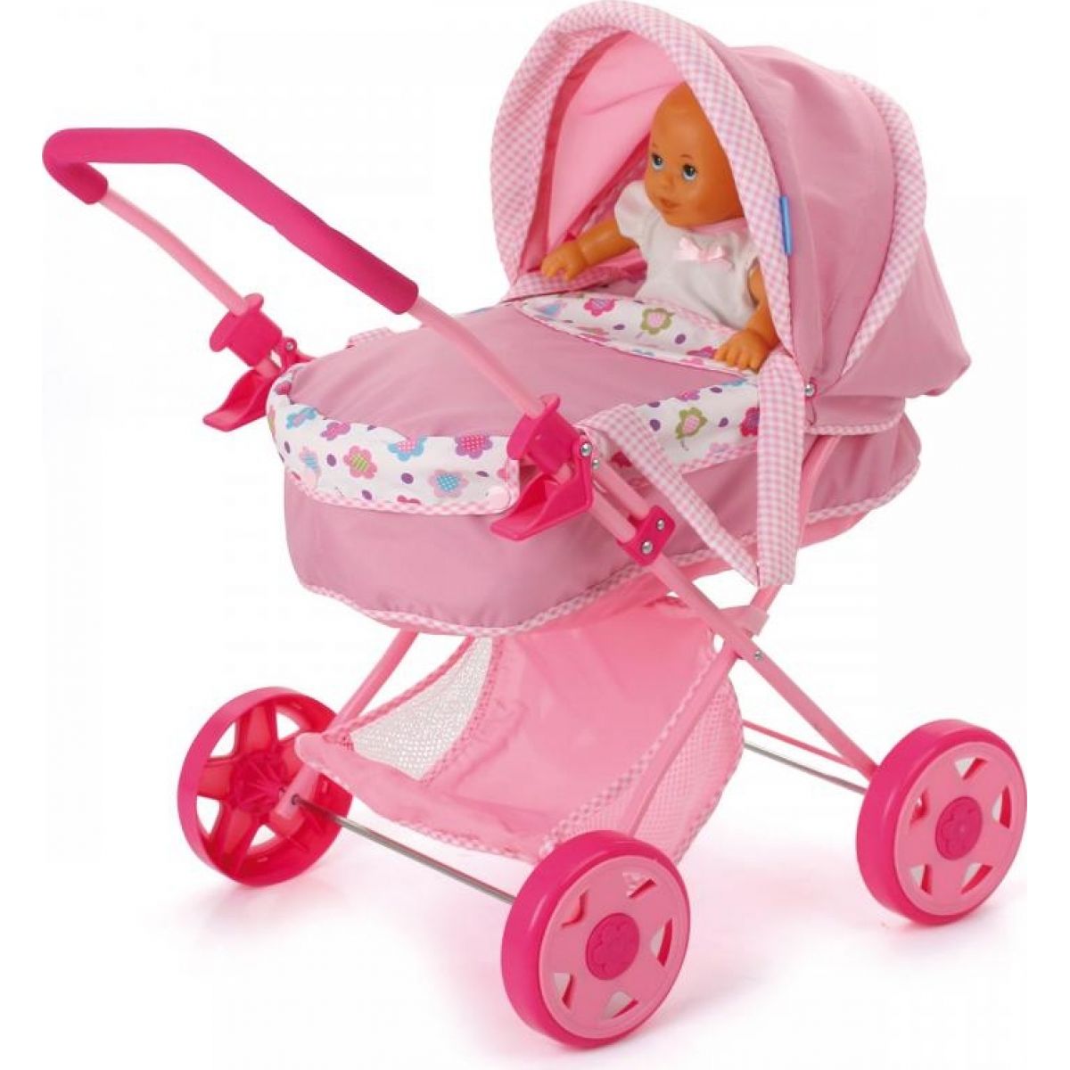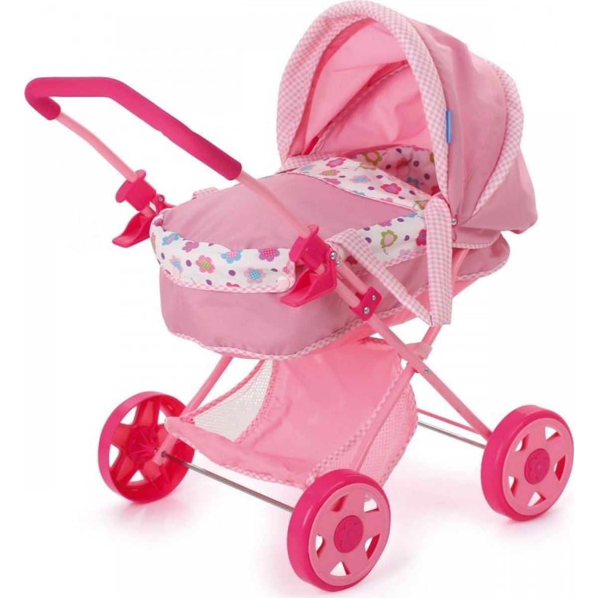 Dětský hluboký kočárek pro panenky v růžové barvě s kytičkami. Vhodný pro panenku do 46 cm
