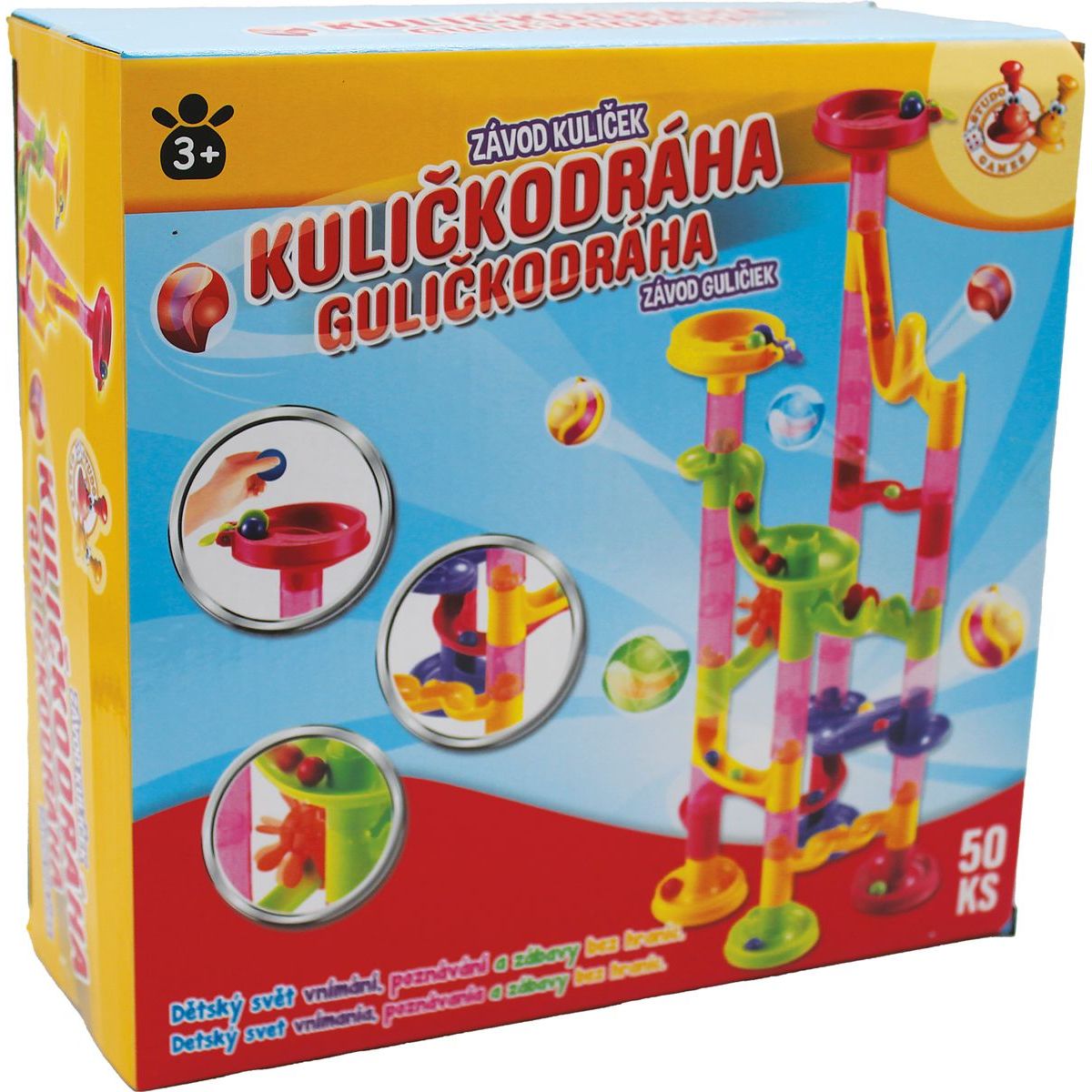 Guličkovú dráhu si môžu deti zostaviť z farebných plastových dielikov.