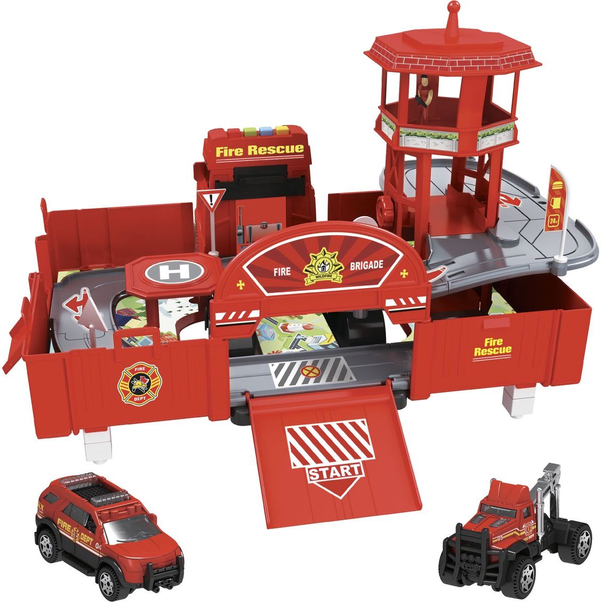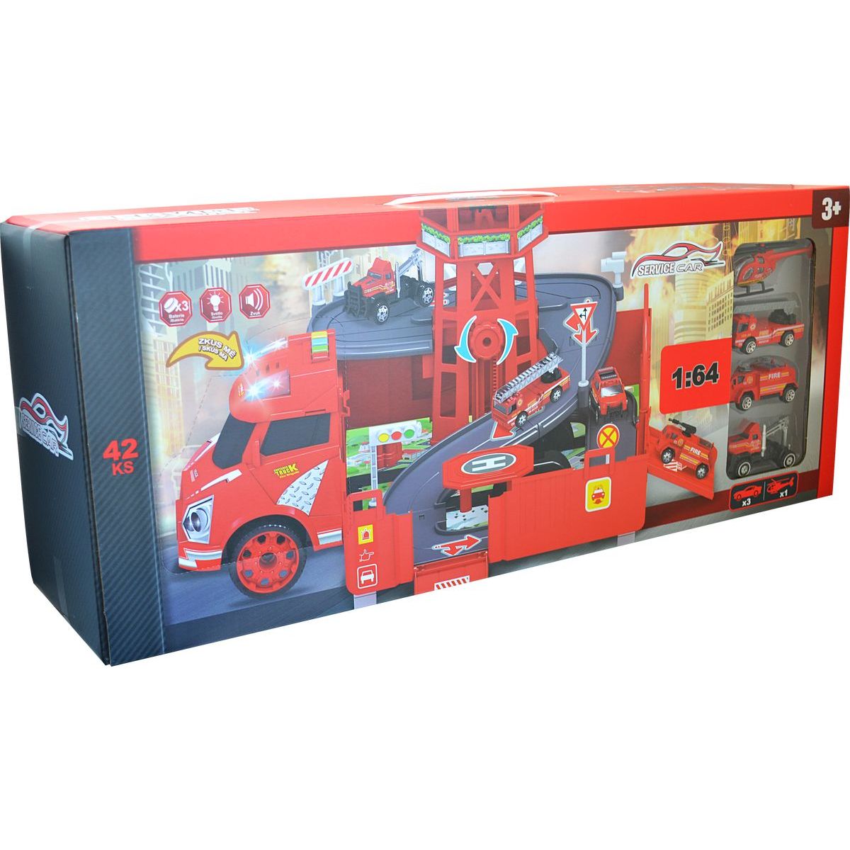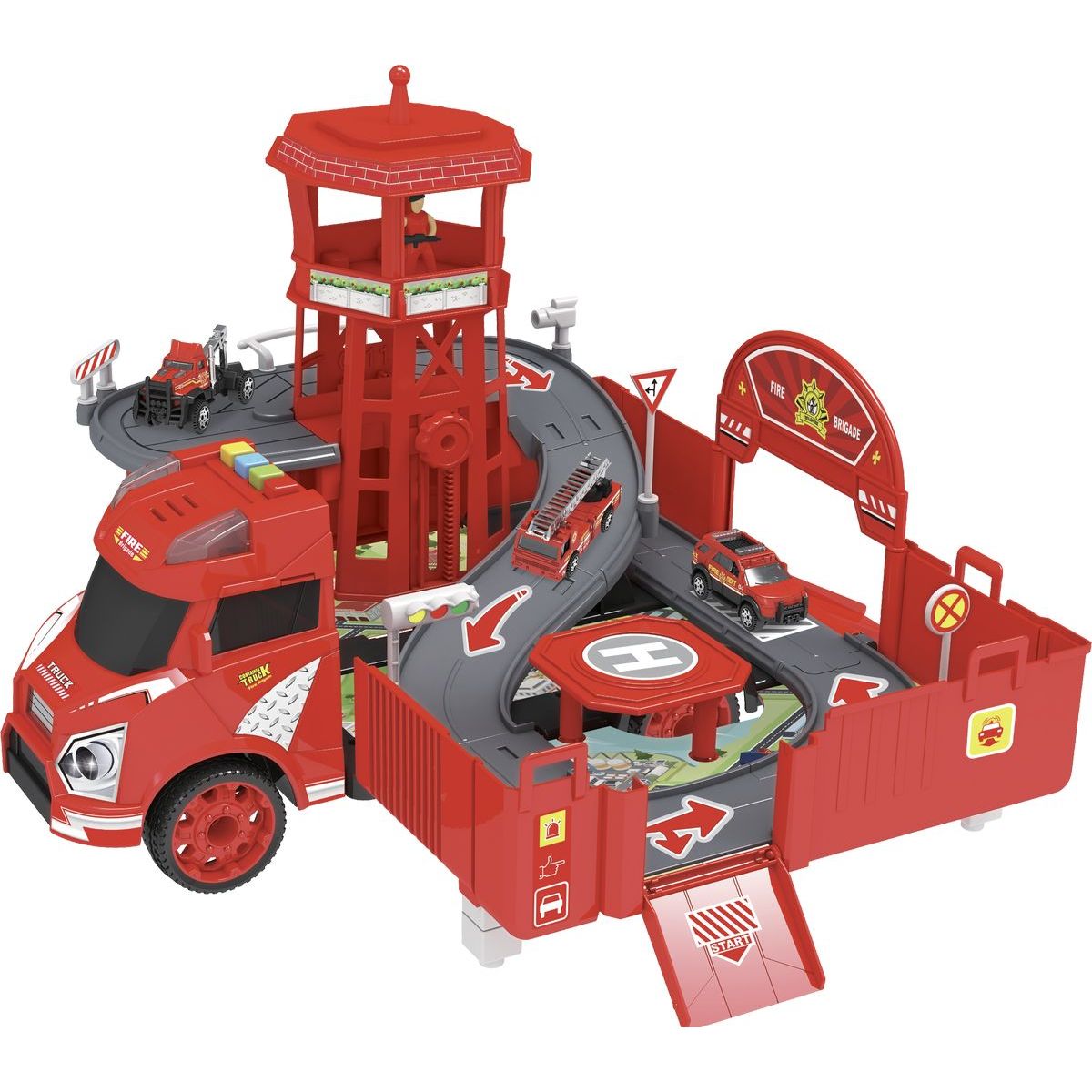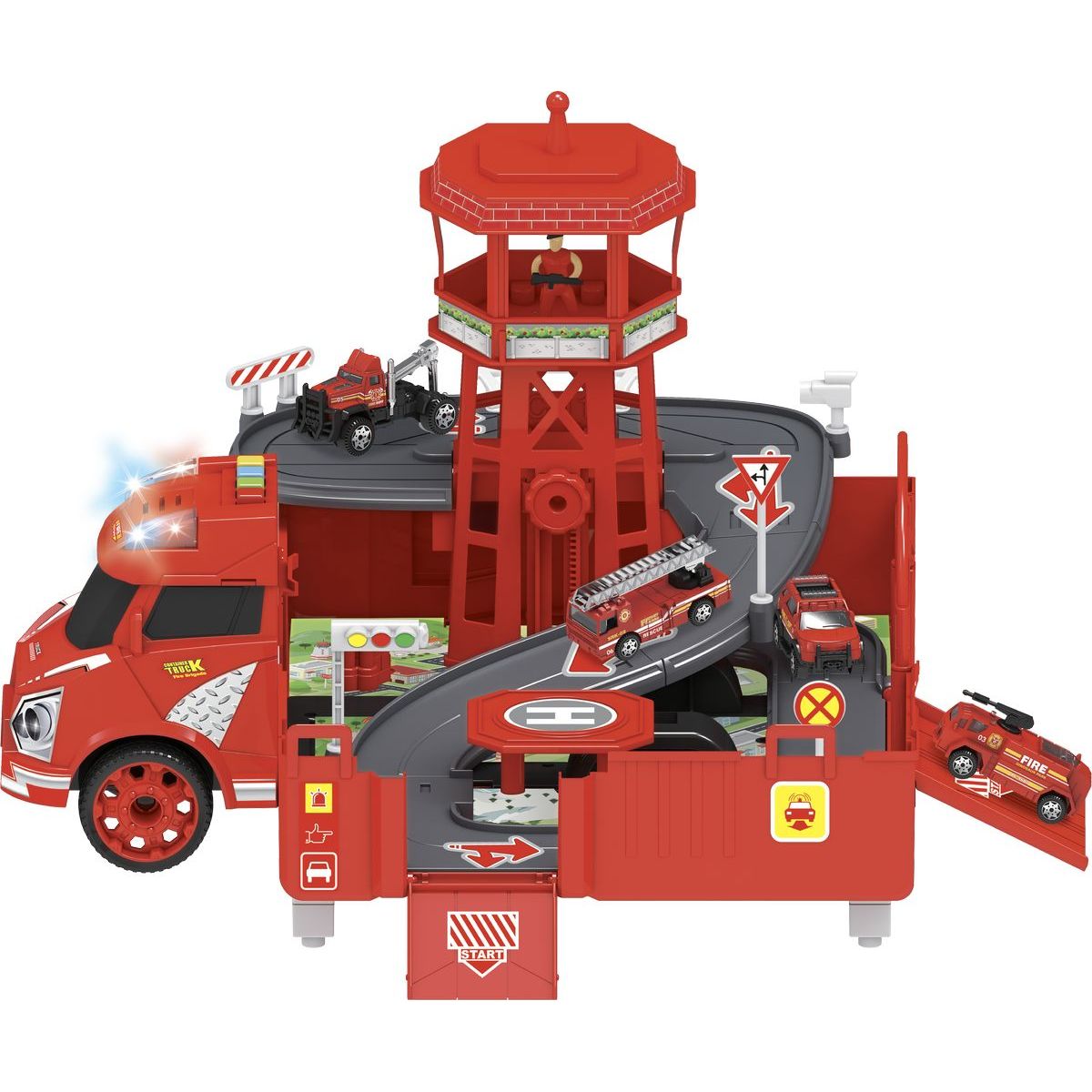 Hasičský voz ponúka malým požiarnikom parádny zábavu. Kamión možné rozložiť na celý okruh s vežou a heliportom a spätne sa premeniť v garáž s hasičskými vozidlami.