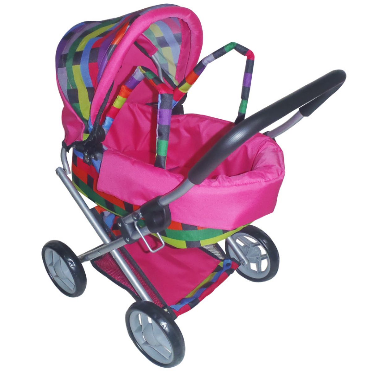 Krásný kočárek s úložným košíkem, polohovatelnou opěrkou zad a vkládací taškou na panenky. Kovová konstrukce s plastovými doplňky vybavená úložným košíkem.