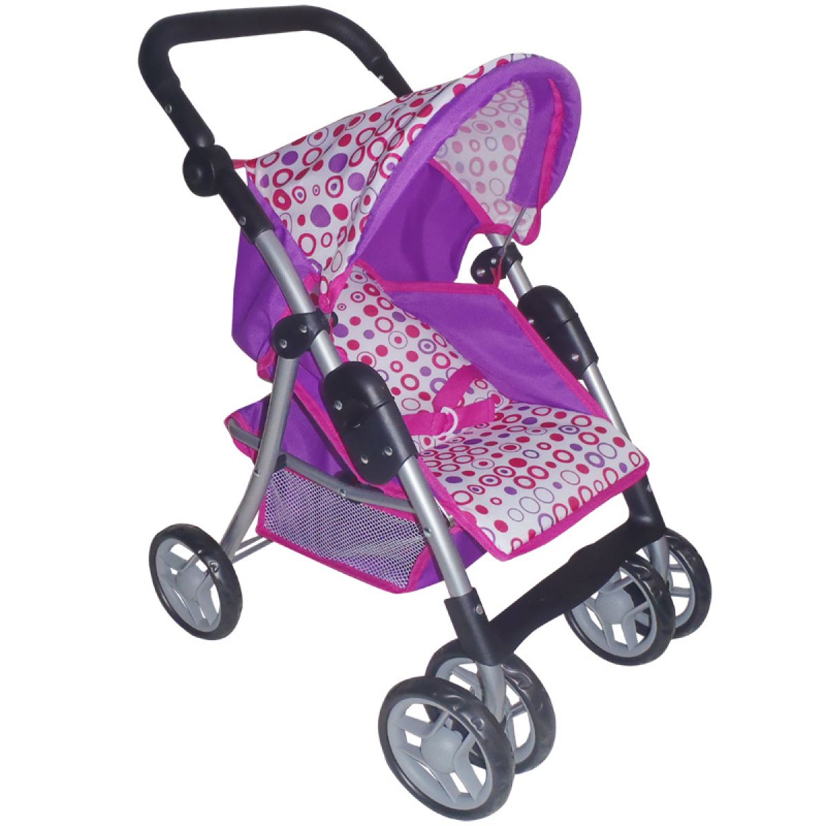 Krásný sportovní kočárek s úložným košíkem a upínacími popruhy pro panenku. Kočárek má zdvojená přední kola.