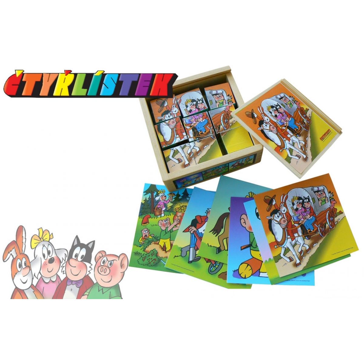 Devět kousků klasických dřevěných kostek s motivem Čtyřlístku si mohou děti skládat podle obrázkové předlohy, která je součástí balení. Kromě obrázků si mohou stavět svoje první komíny a věže.