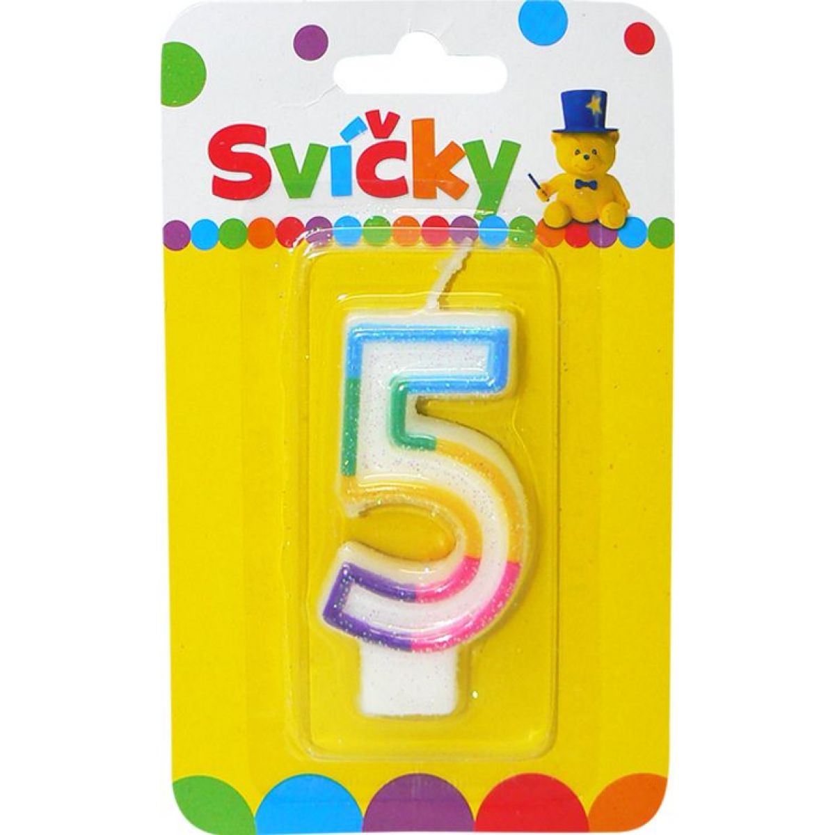 Sviečka v tvare čísla 5, je jednou zo samostane balených číslic, ktorá je určená pre zdobenie narodeninovej torty. Biely vosk je konturovaný farebným obrysom. V spodnej časti je plastový stojanček, ktorý sa zasúva do torty tak, aby číslo nebalancovalo a mohlo byť osadené vzpriamene. Fotografia je len ilustratívna.