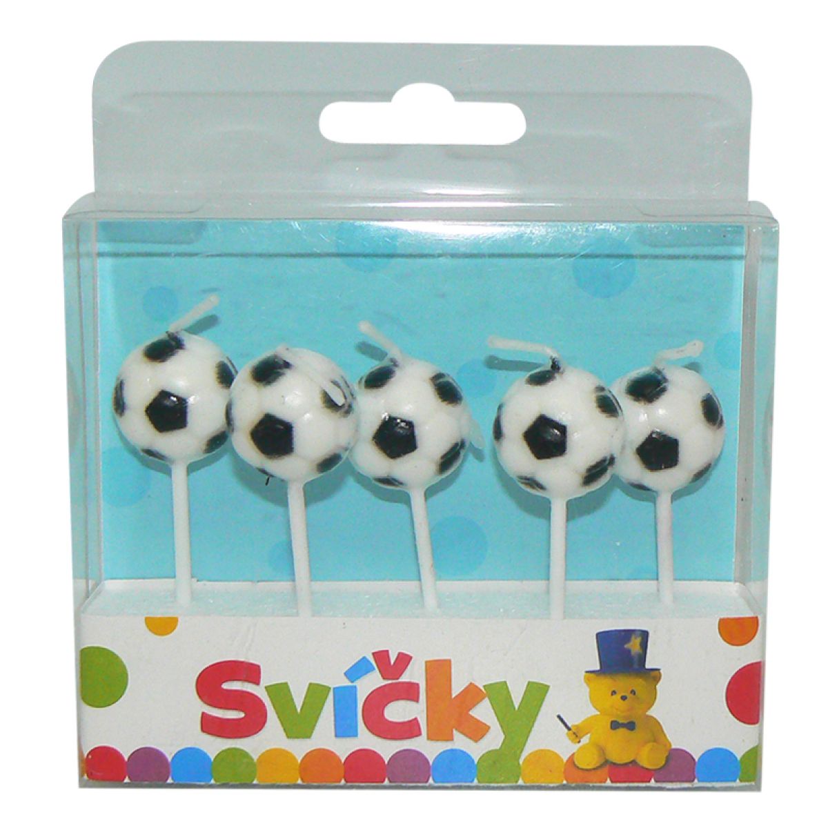 Narodeninové futbalové loptičky vo forme sviečok na ozdobenie torty. Každá z piatich plastových sviečok má plastový bodec, pomocou ktorého sa zasúva do torty tak, aby nebalancovala a mohla byť osadená vzpriamene.
