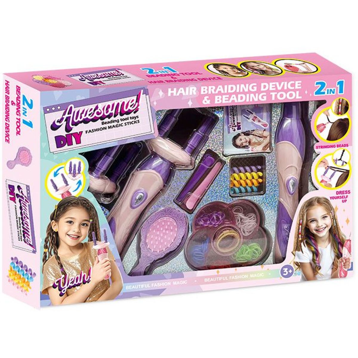 S hracím setom na vlasy 2v1 si môžeš zapletať vrkoče, zdobiť vlasy farebnými korálkami a skúšať nové štýly.