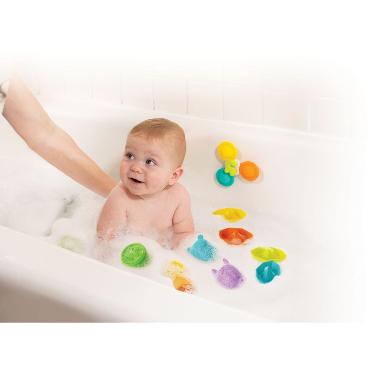 Infantino Sada hračiek do kúpeľa Spin, Squirt & Sail premení každé kúpanie na magický zážitok plný objavovania a zábavy. Jedenásť pestrofarebných silikónových hračiek – stohovateľné lodičky, striekajúce zvieratká, stabilizačné poháriky a víriaca spinner hračka – podporuje jemnú motoriku, koordináciu a rozvoj predstavivosti. Vďaka mäkkému a bezpečnému materiálu sa hračky ľahko držia a čistia, čo zaručuje bezpečnú a radosť prinášajúcu hru vo vode.