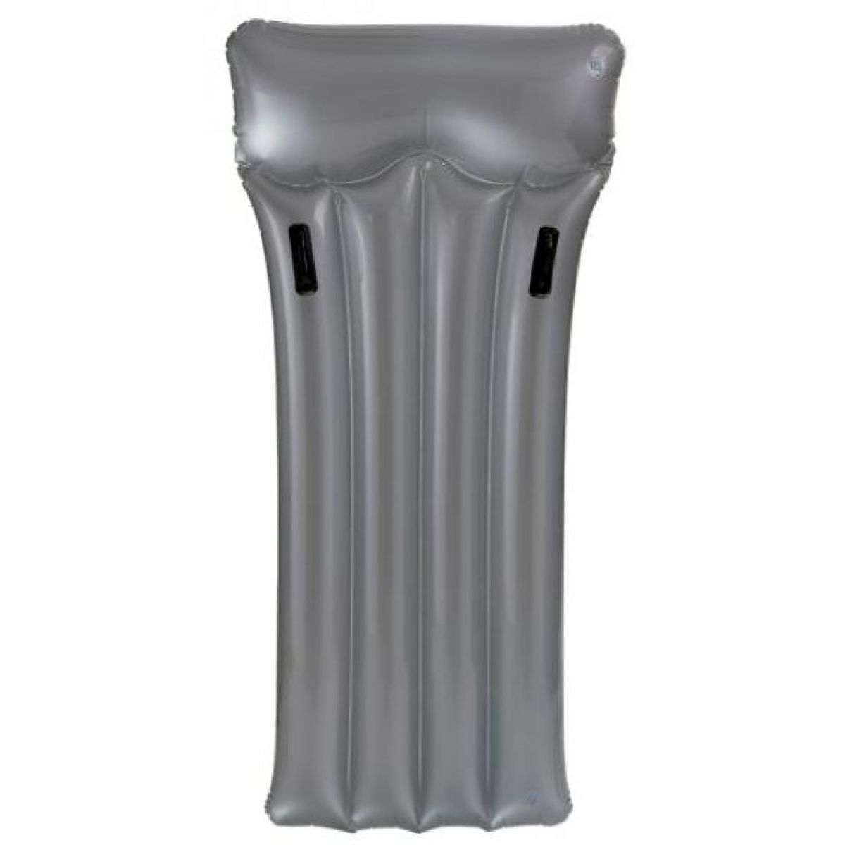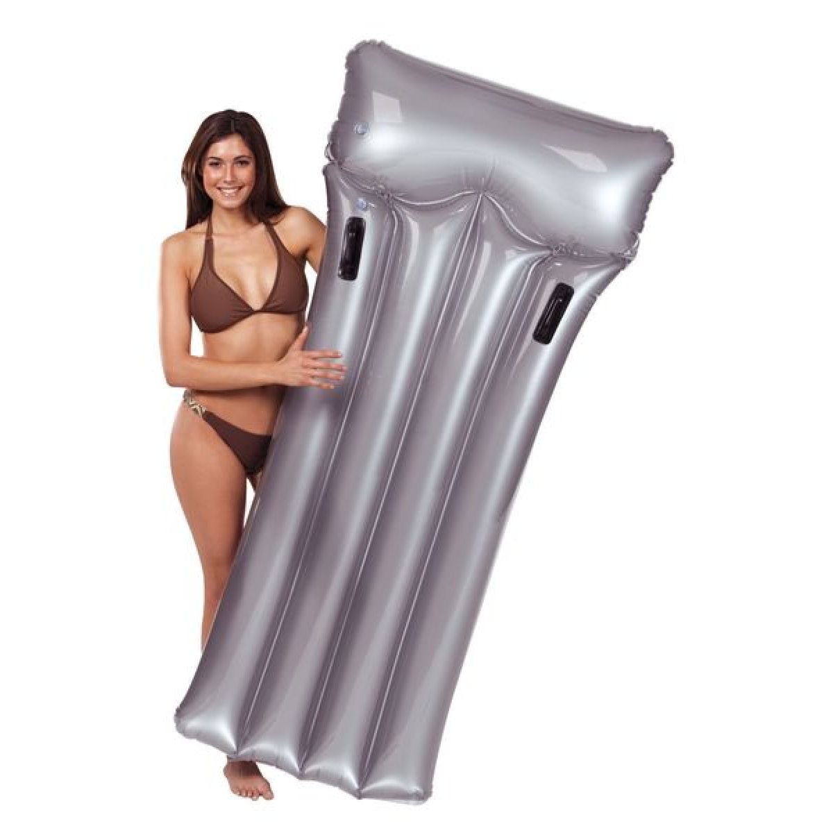 Stříbrnošedý kovový povrch se stal námětem jedné ze zábavných nafukovacích matrací Intex, která je z druhé strany průhledná.