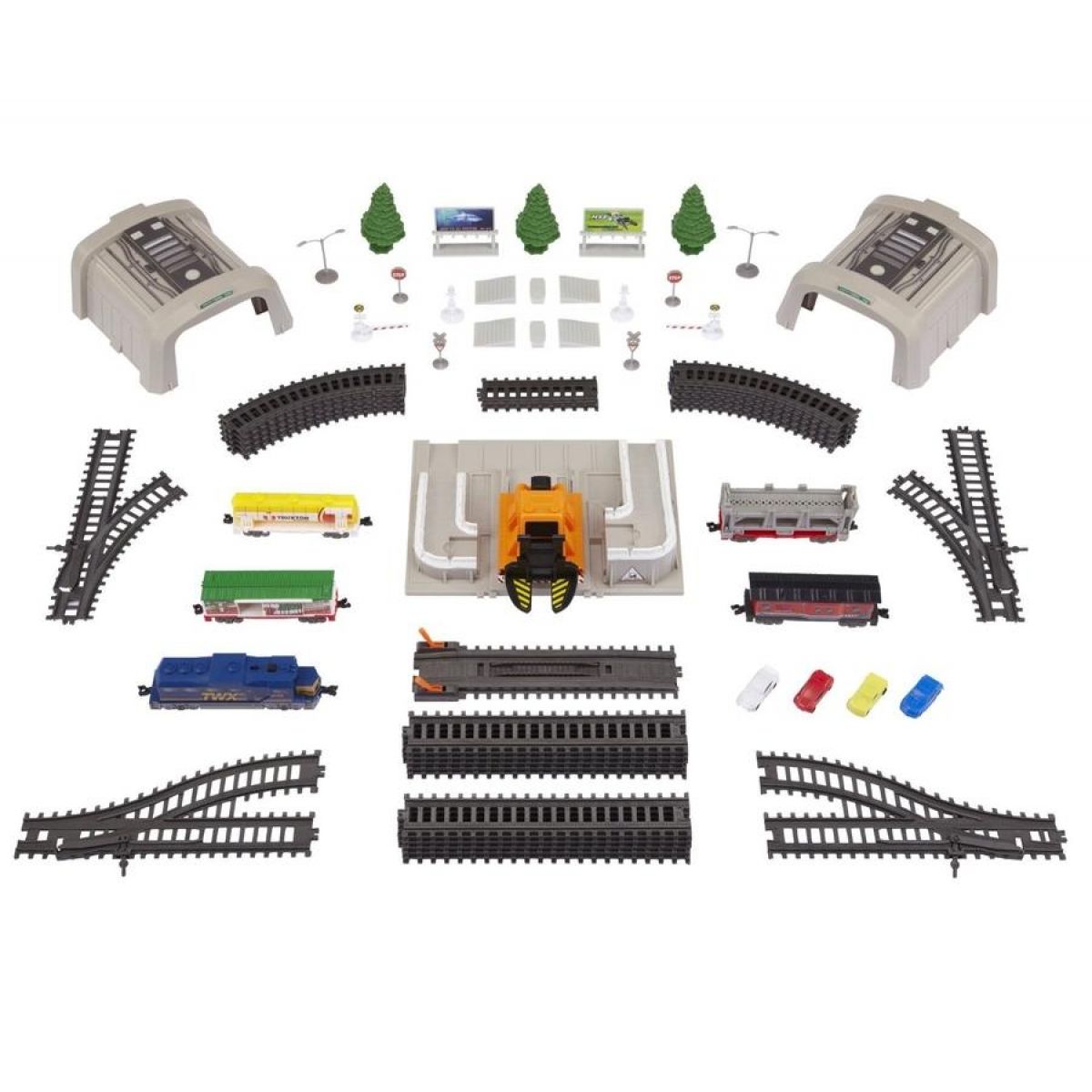 Sada obsahuje autonakladač, motorizovanou lokomotivu na baterie (2x AAA), 4 vagóny, 28 dílů kolejí = 549 cm dráhy, 2 tunely a 20 doplňků. Další části lze dokoupit samostatně.