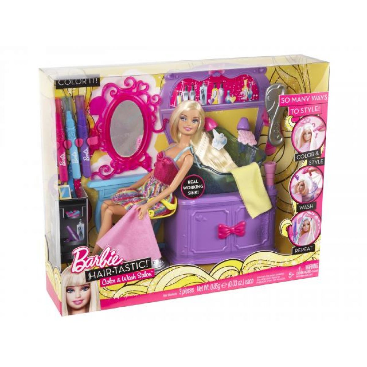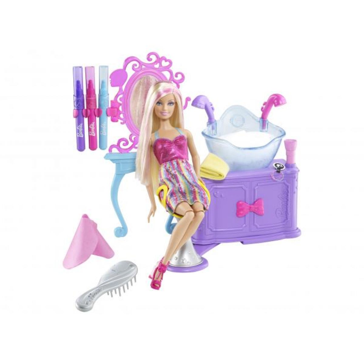 Panence Barbie lze ve vlasech udělat barevné proužky (růžové, fialové nebo modré). Barvu lze smýt pomocí opravdového pěnícího šampónu a vody. Na výběr jsou 3 barevná pera, kterými lze panence Barbie udělat ve vlasech barevné proužky a potom bublinkami a vodou smýt, stačí otočit knoflíkem a stlačit.