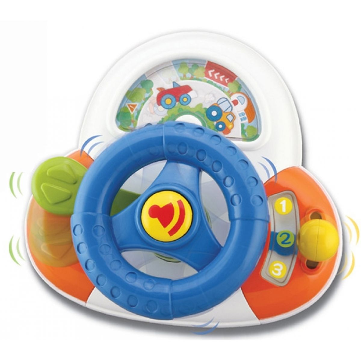 Mini simulátor řízení čeká na nejmenší děti. Aby se jim zkoušelo řízení dobře, mohou rodiče dětem upevnit mini simulátor přísavkami k hladké ploše. Při otočení volantu se začne pohybovat krajina na obrázku.