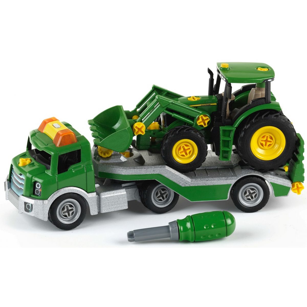 Transporter s traktorem je připraven pro chlapce od 3 let, kteří rádi rozebírají, sestavují, montují a rádi by si vyzkoušeli profesi opraváře zemědělských strojů. Mohou si traktor jak rozšroubovat, tak posléze smontovat opět do funkční podoby.