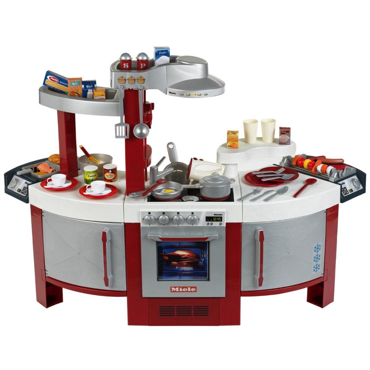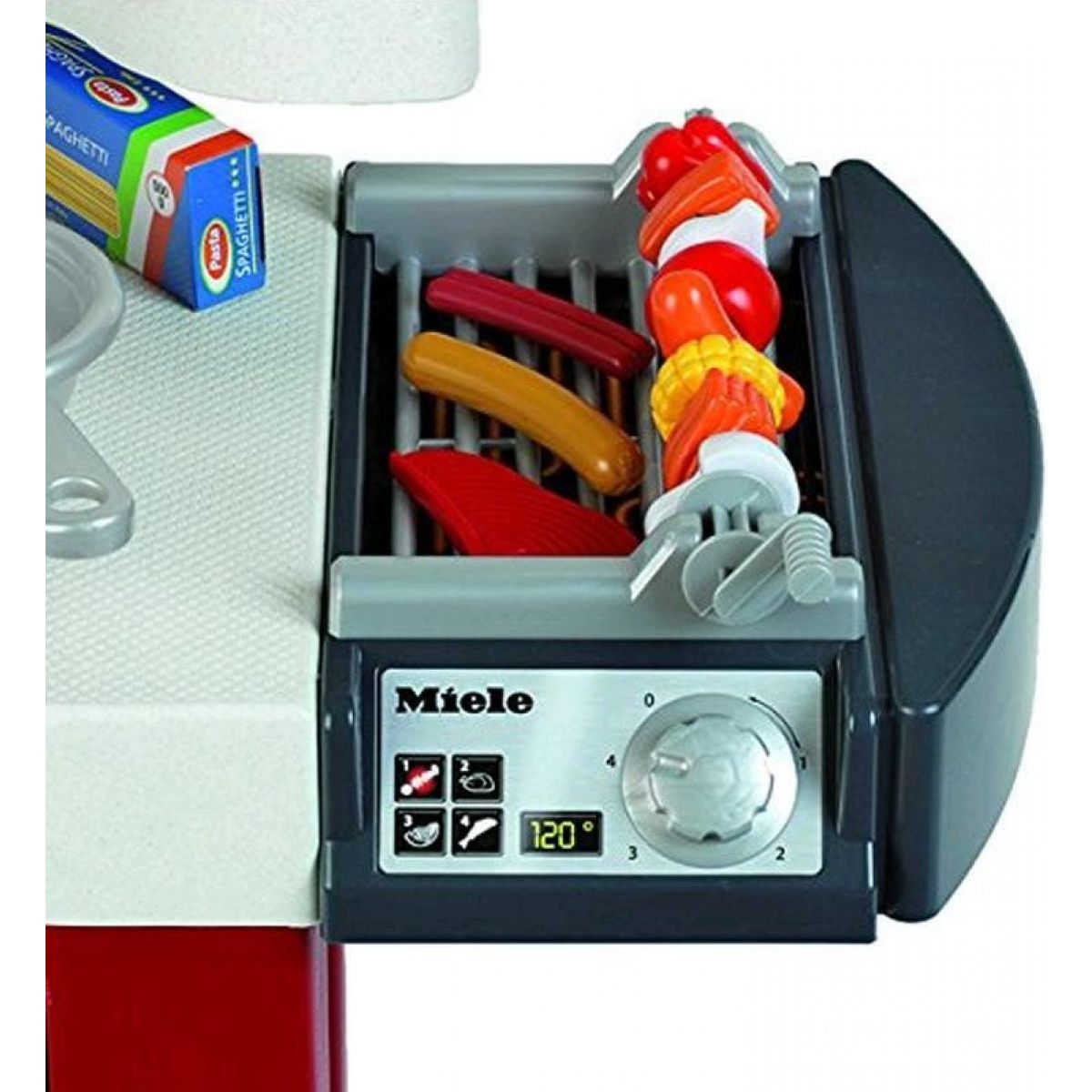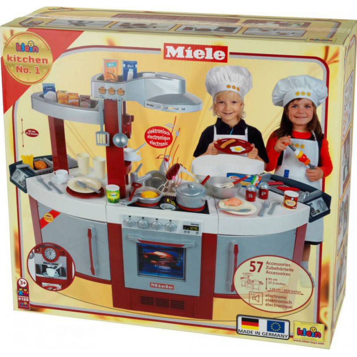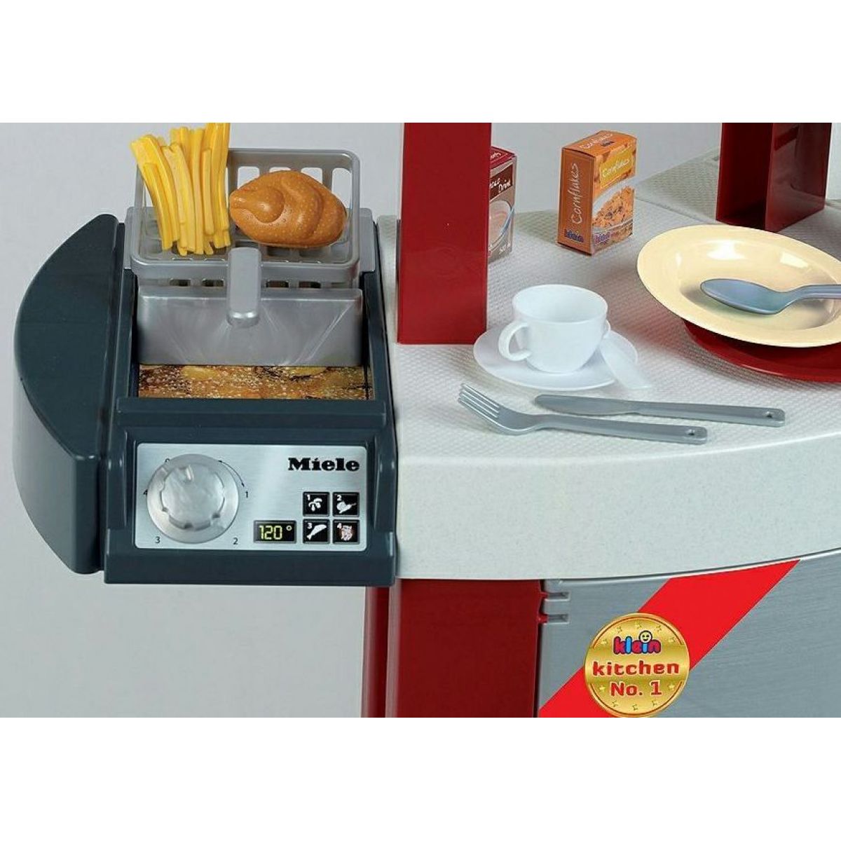 Kuchynka Miele pre malé kuchárky. Vydává zvuky pri varení úplne ako naozajstná kuchyňa. Balenie obsahuje vyobrazené príslušenstvo 40  kusov. Z jednej strany si kuchárky môžu varit a piecť a z druhej strany si umyjú v dreze alebo v umývačke riad. Rúra svieti a v sete je aj chladnička. Veľkosť pracovnej plochy je 130 cm a výška kuchynky je cca 95cm. Potrebné sú 2 batérie typu AAA, ktoré nie sú súčasťou balenia. Vek: 3+,