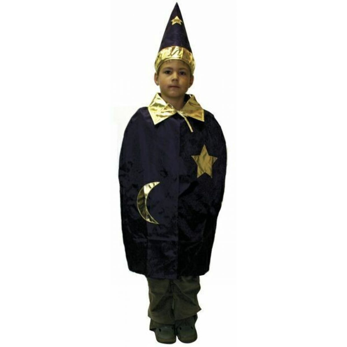 Středně dlouhá pláštěnka zdobená zlatými hvězdami a límcem, s černokněžnickým kloboukem.