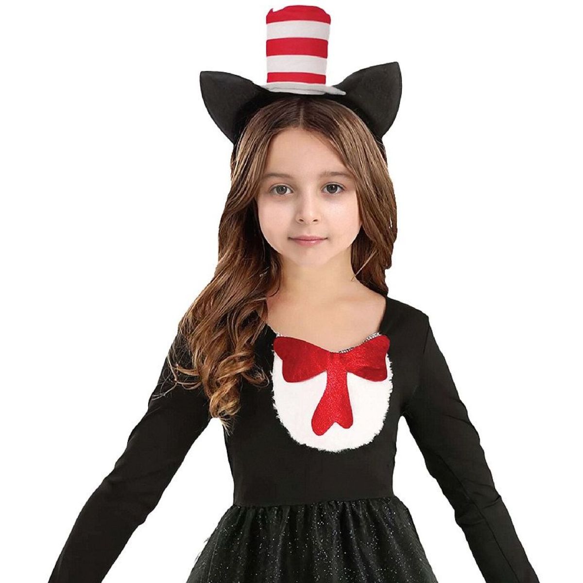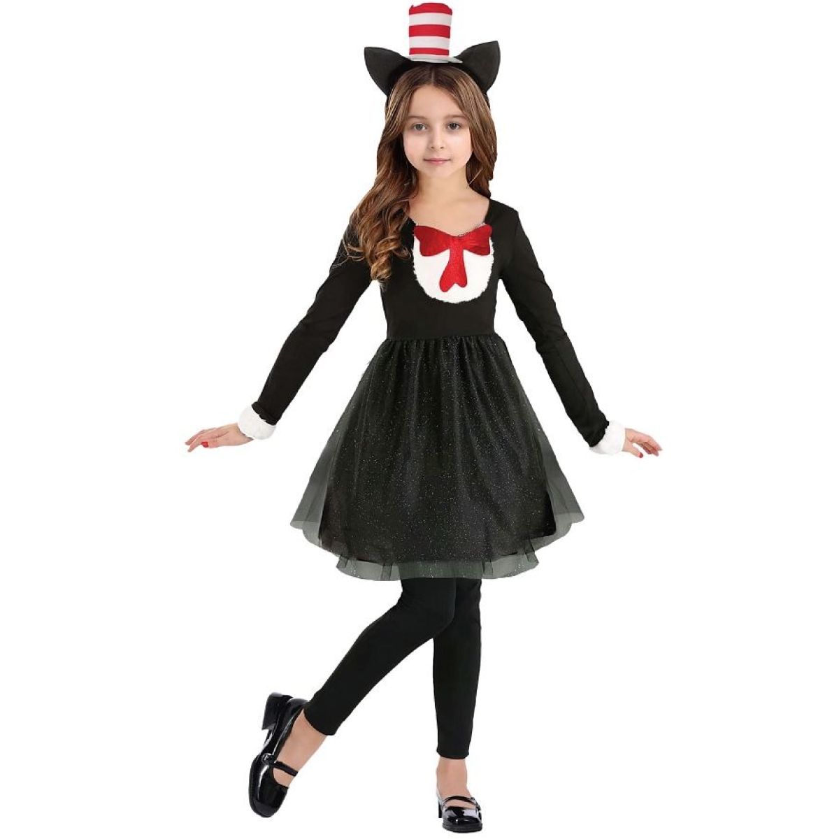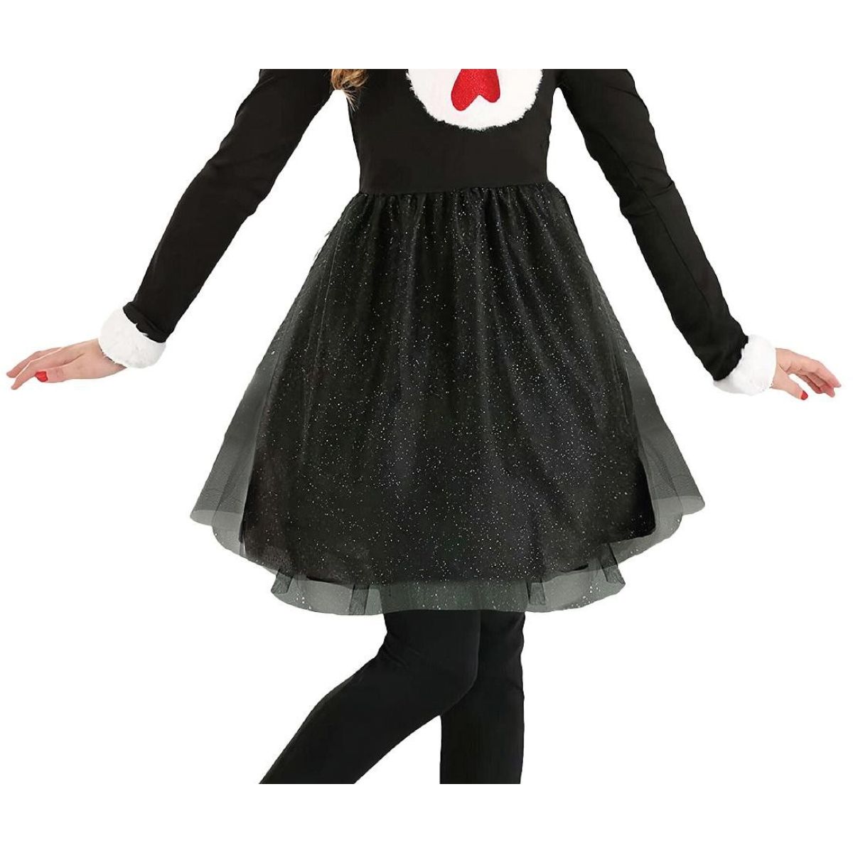 Detský kostým Čierna mačička vo veľkosti 110–120 cm premení malé slečny na roztomilé a hravé mačacie bytosti. Elegantné čierne šaty s bielym golierom a červenou mašľou vytvárajú výrazný kontrast, ktorý dodáva kostýmu šmrnc. Trblietavá tylová sukňa sa pri pohybe jemne vlní a pridáva kostýmu rozprávkový nádych.