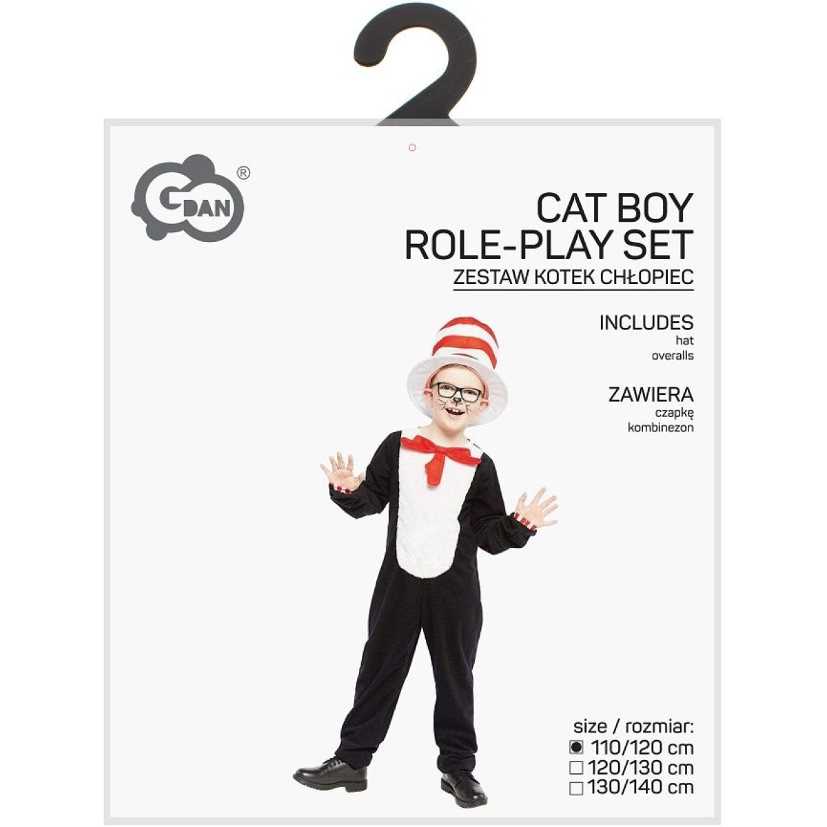 Štýlové zakončenie rukávov s červeno-bielymi pruhmi a výrazný pruhovaný klobúk dodávajú kostýmu rozprávkový charakter a jednotný vzhľad. Mäkké a ľahké materiály zabezpečujú pohodlie aj pri dlhšom nosení počas karnevalu, tematických osláv alebo domáceho hrania. Kostým je ideálnou voľbou pre chlapcov, ktorí chcú zažiariť ako veselý čierny kocúr.