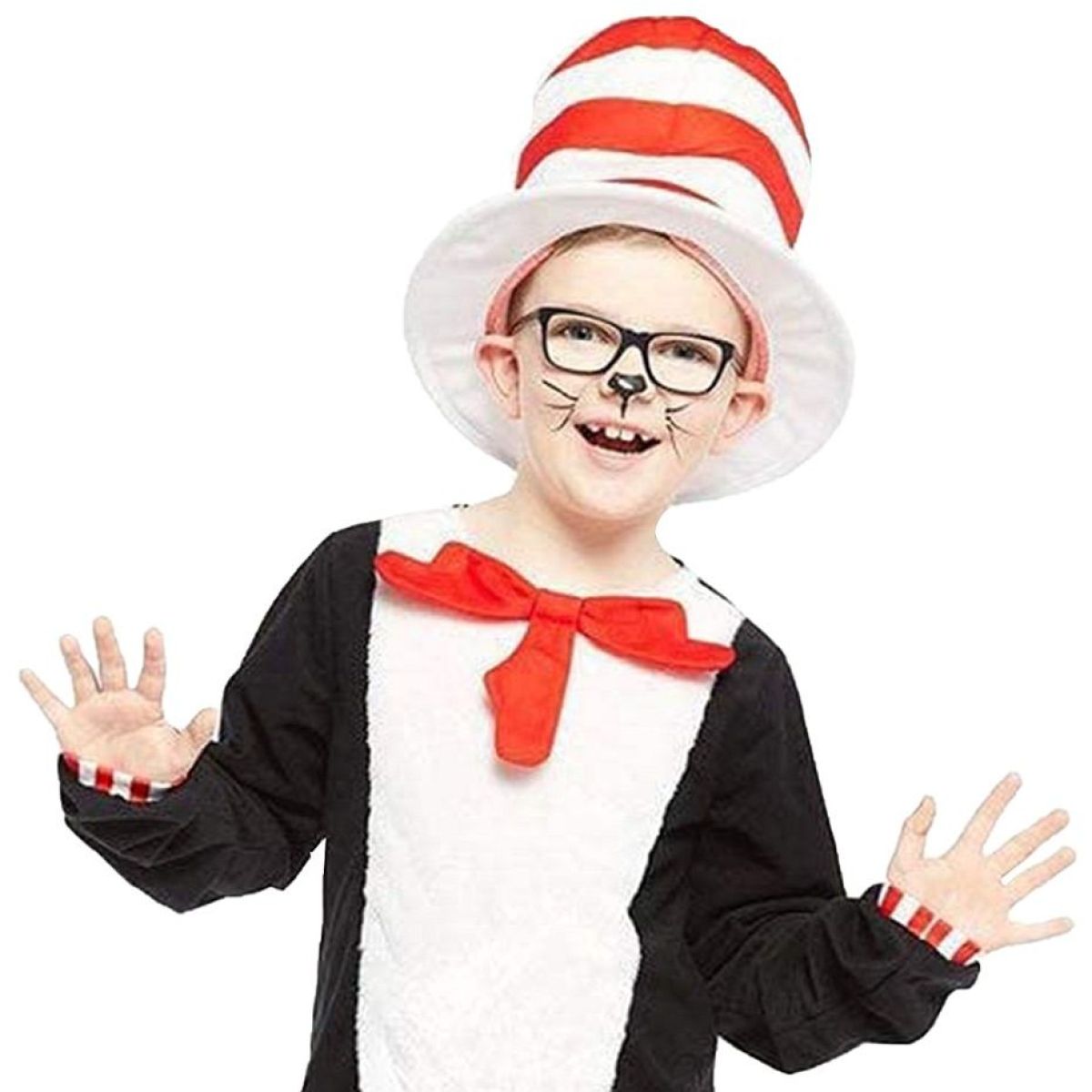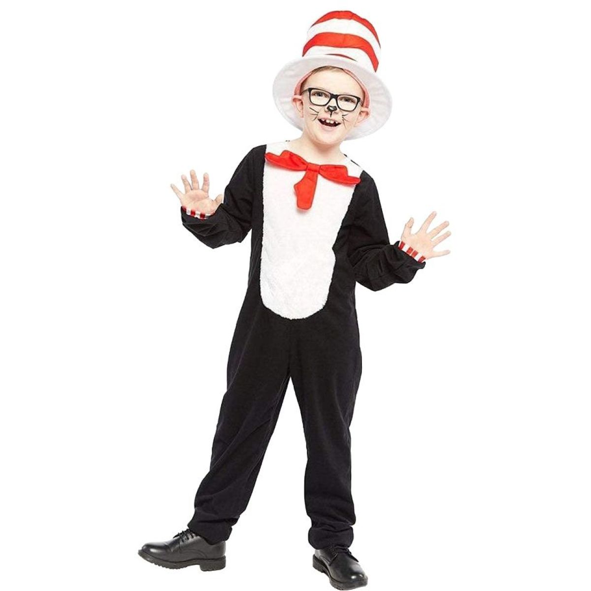 Štýlové zakončenie rukávov s červeno-bielymi pruhmi a výrazný pruhovaný klobúk dodávajú kostýmu rozprávkový charakter a jednotný vzhľad. Mäkké a ľahké materiály zabezpečujú pohodlie aj pri dlhšom nosení počas karnevalu, tematických osláv alebo domáceho hrania. Kostým je ideálnou voľbou pre chlapcov, ktorí chcú zažiariť ako veselý čierny kocúr.