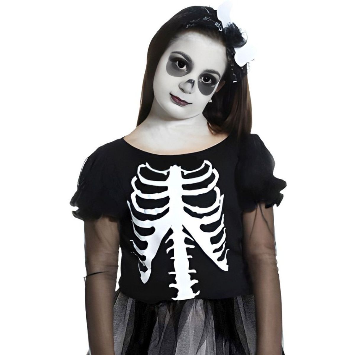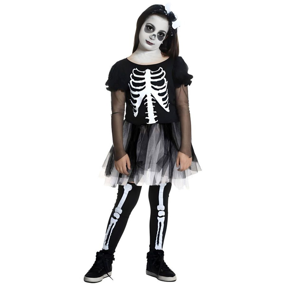 Živôtik v čiernej farbe zdobí výrazná potlač rebier a chrbtice, ktorá dodáva kostýmu autentický „kostlivčí“ vzhľad. Rukávy z jemného priesvitného tylu pridávajú šatám ľahkosť a tajomnú atmosféru. Nadýchaná sukňa z viacerých vrstiev čierneho a bieleho tylu sa pri pohybe krásne vlní a podčiarkuje dievčenský charakter kostýmu.