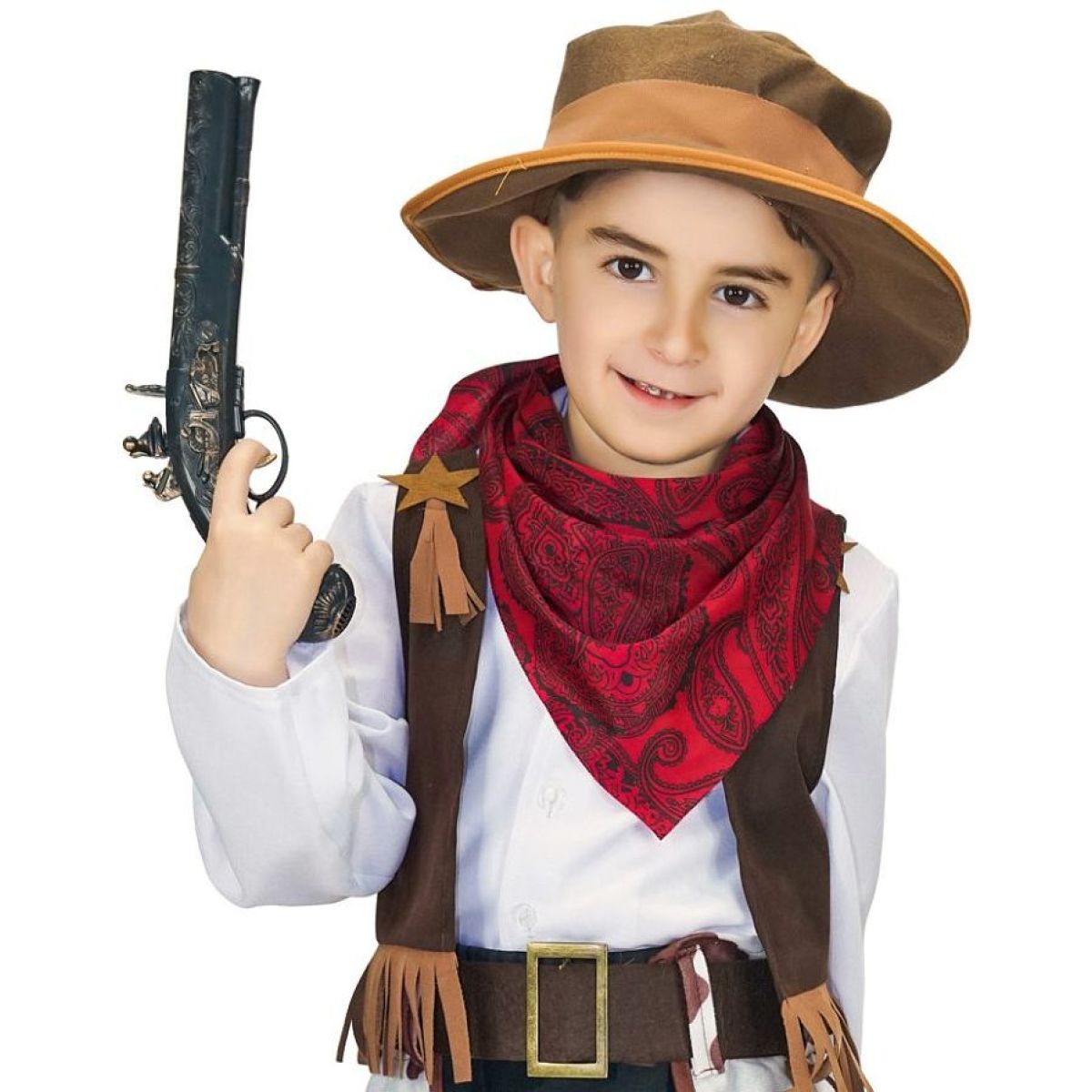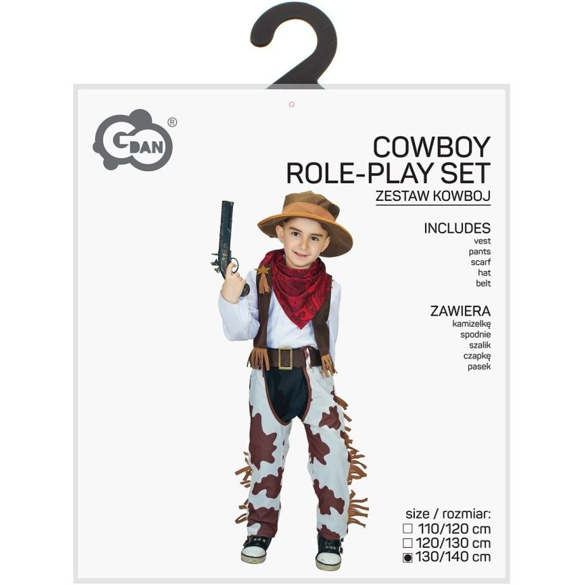 Štýlové nohavice s motívom kravskej kože a strapcami, tmavá vesta so zlatou hviezdou, kovbojský klobúk, opasok s veľkou prackou a červená šatka vytvárajú kompletný outfit, v ktorom sa malý kovboj bude cítiť pohodlne aj sebavedomo. Kostým je určený pre deti od 3 rokov a podporuje fantáziu, kreativitu a radosť z pohybu.