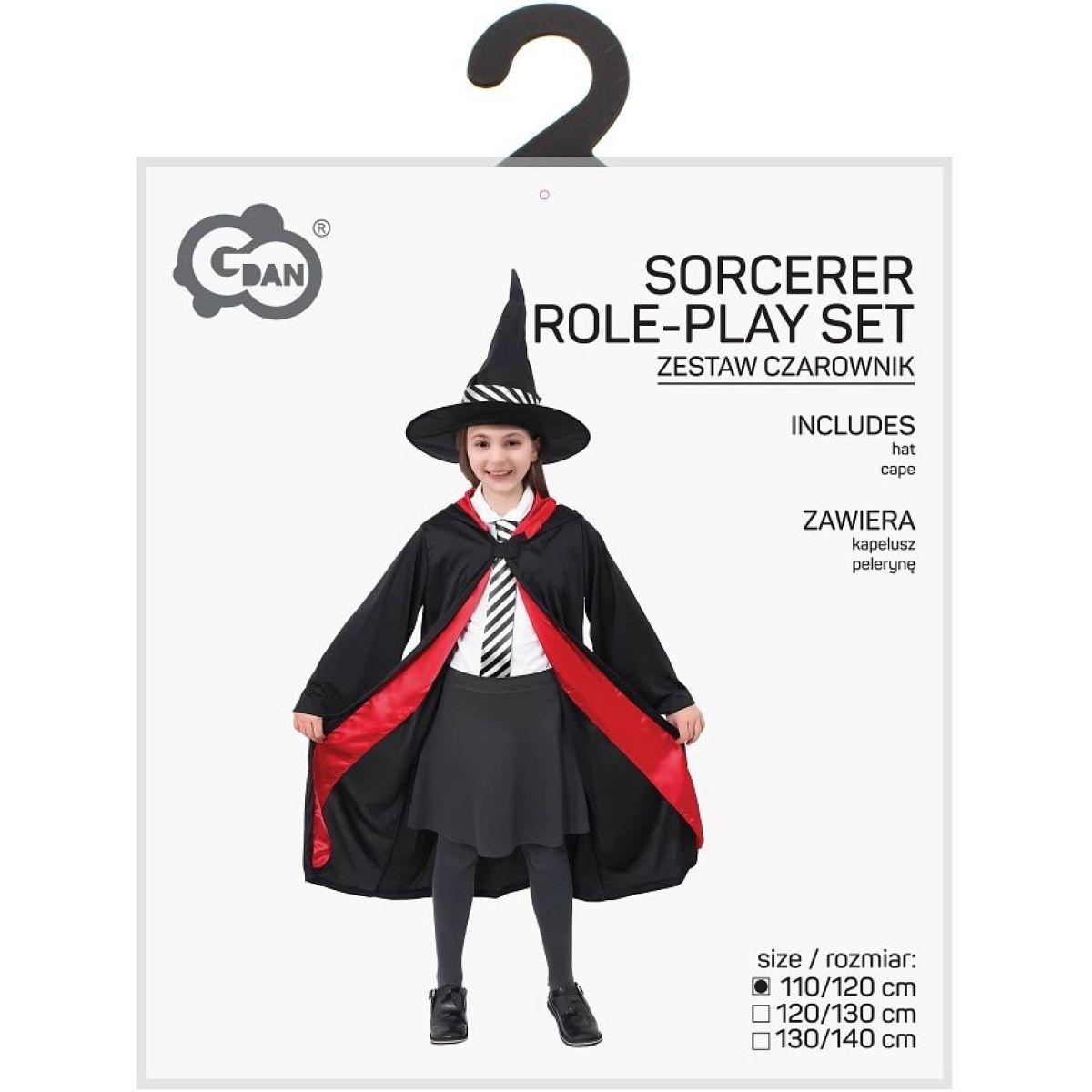 Vysoký špicatý klobúk v čiernej farbe s čiernobielym pásikom dodáva kostýmu klasický kúzelnícky vzhľad. Univerzálny dizajn je vhodný pre malých kúzelníkov aj kúzelnice, ktorí chcú očariť svoje okolie a premeniť obyčajný deň na magické dobrodružstvo.