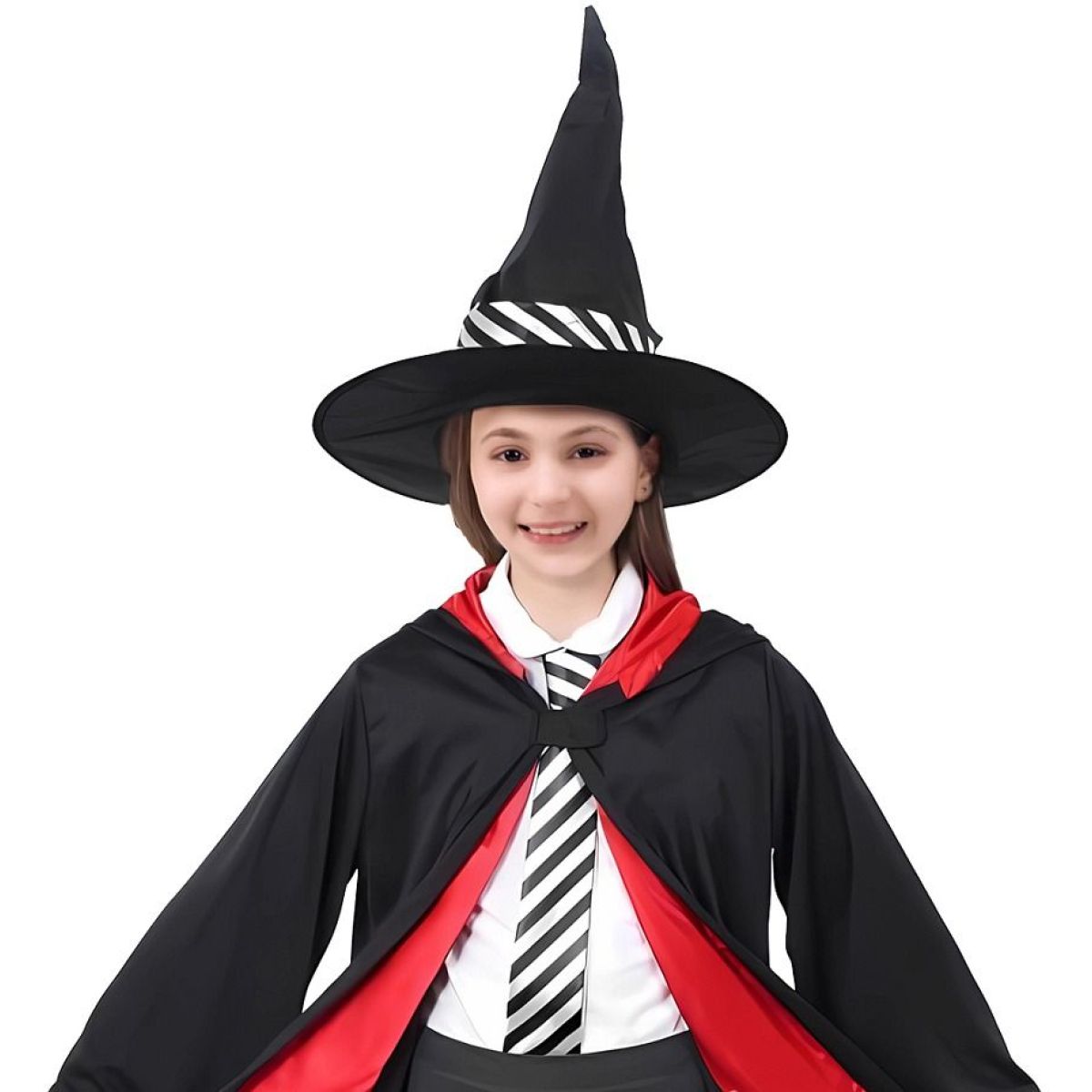 Vysoký špicatý klobúk v čiernej farbe s čiernobielym pásikom dodáva kostýmu klasický kúzelnícky vzhľad. Univerzálny dizajn je vhodný pre malých kúzelníkov aj kúzelnice, ktorí chcú očariť svoje okolie a premeniť obyčajný deň na magické dobrodružstvo.