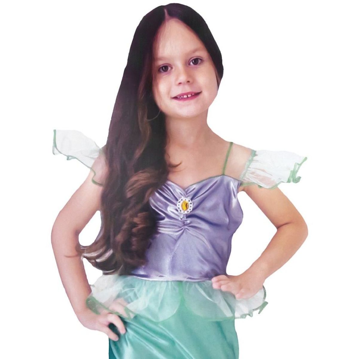 Tenké ramienka s priehľadnými volánikmi a zeleným lemovaním podčiarkujú nežný vzhľad celého kostýmu. Vďaka ľahkým a príjemným materiálom je kostým pohodlný na nosenie a vhodný nielen na karnevaly, ale aj na tematické oslavy, vystúpenia či fotenie. Ideálna voľba pre deti, ktoré milujú rozprávkové postavy a podmorskú fantáziu.