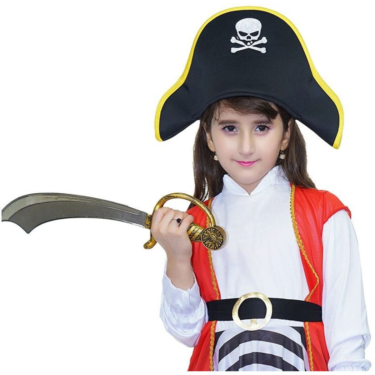 Dominantným doplnkom je čierny pirátsky klobúk so žltým lemovaním a ikonickou lebkou s hnáťami. Celkový vzhľad dopĺňajú čierne návleky na topánky, ktoré imitujú vysoké pirátske čižmy. Kostým je pohodlný, ľahký a pripravený na každé pirátske dobrodružstvo.