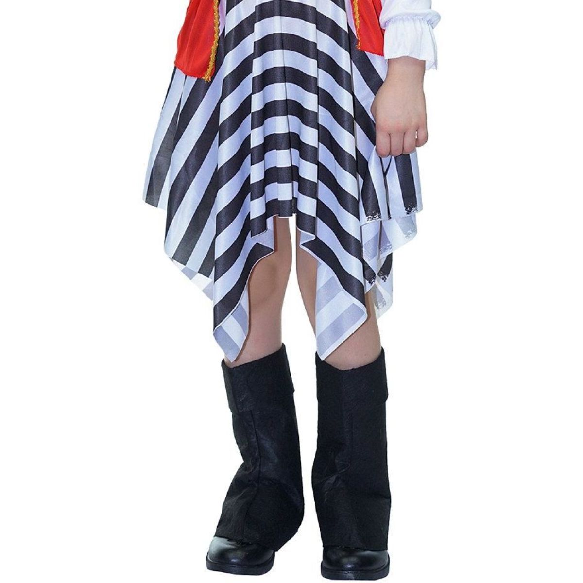 Biela blúzka s dlhými rukávmi tvorí základ kostýmu a dodáva mu ľahkosť. Červená vesta so zlatým lemovaním prináša výrazný farebný akcent a podčiarkuje pirátsky charakter. Pruhovaná sukňa s nepravidelným strihom pôsobí hravo a autenticky, zatiaľ čo čierny opasok so zlatou prackou krásne zvýrazní pás.
