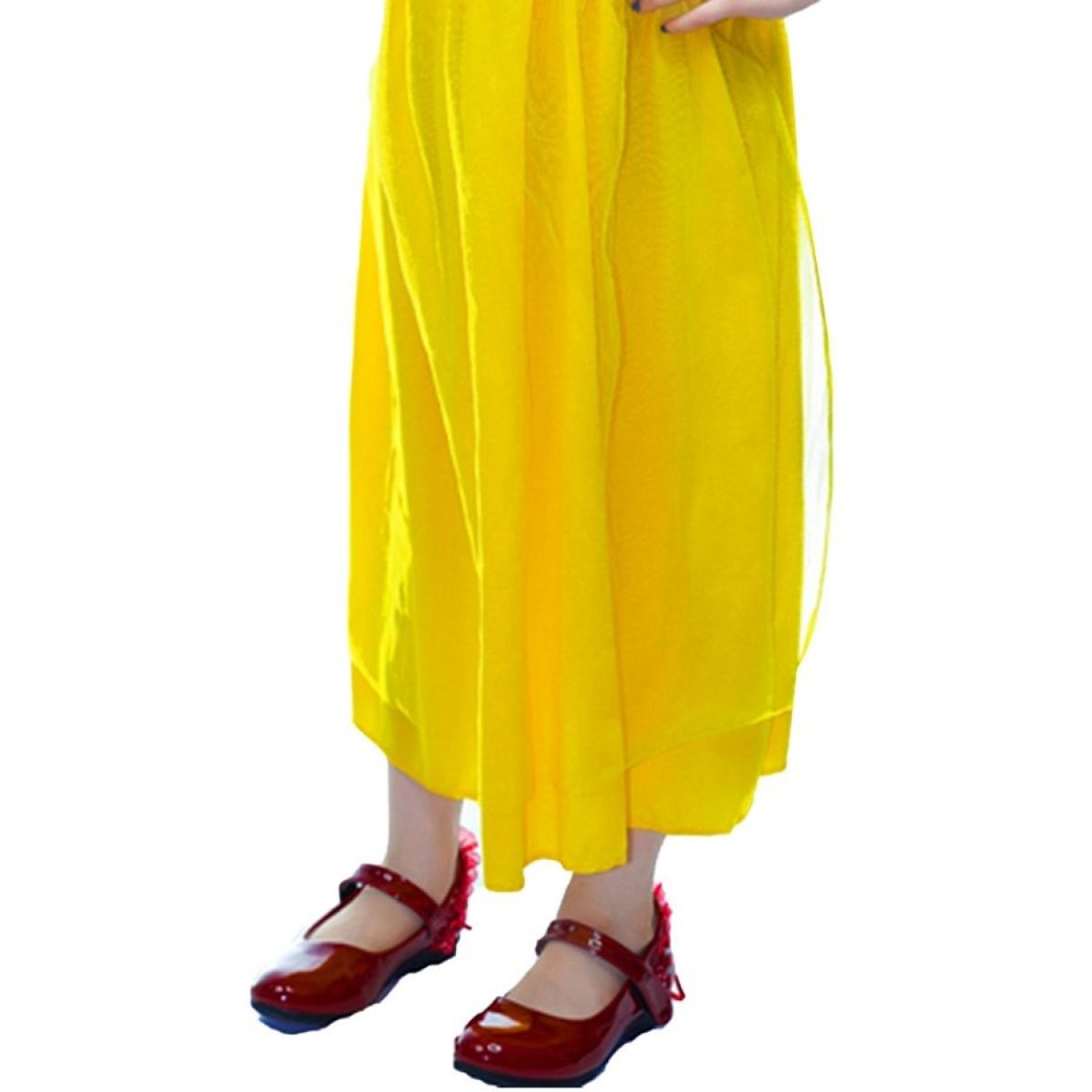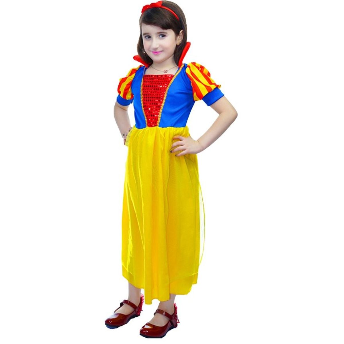 Ľahká žltá sukňa sa pri pohybe jemne vlní a dodáva kostýmu ladnosť. Červená čelenka s mašľou krásne dopĺňa celý vzhľad a pomáha dotvoriť autentickú podobu rozprávkovej postavy. Vďaka ľahkému a príjemnému materiálu sú šaty pohodlné na nosenie a vhodné aj na dlhšie karnevalové oslavy alebo detské hry.
