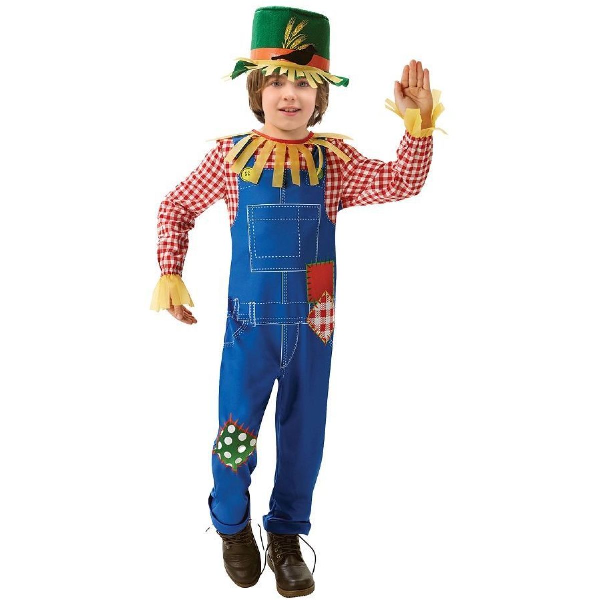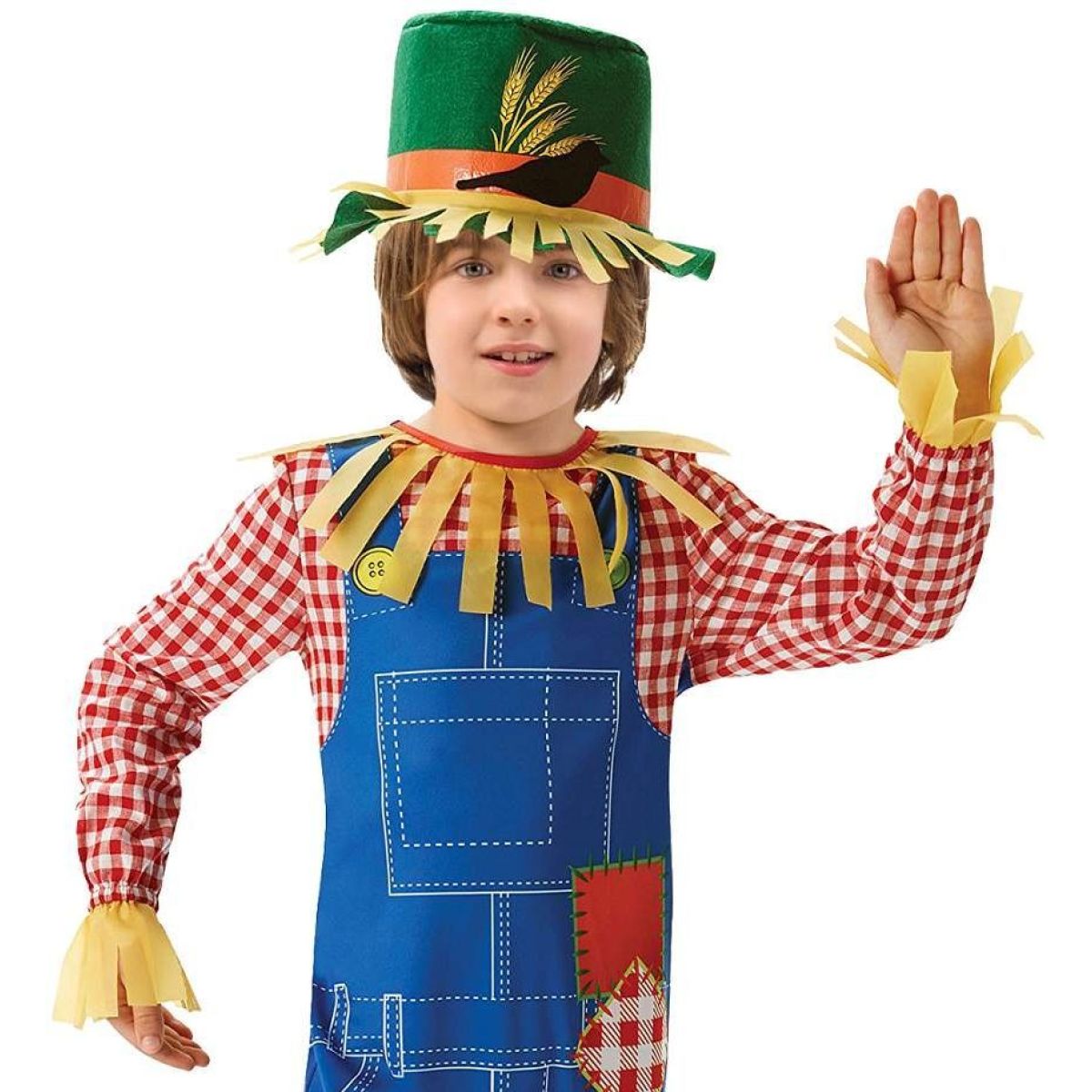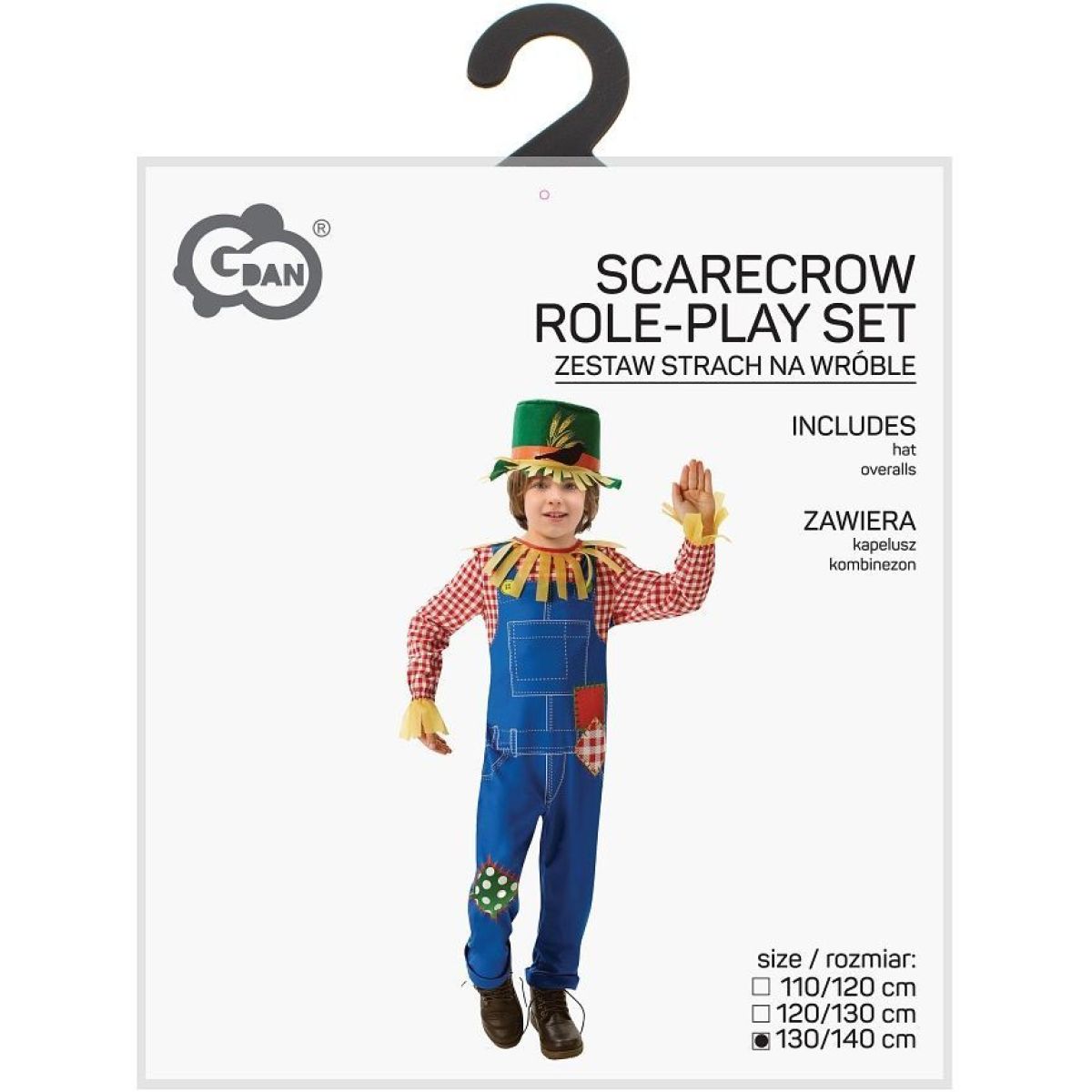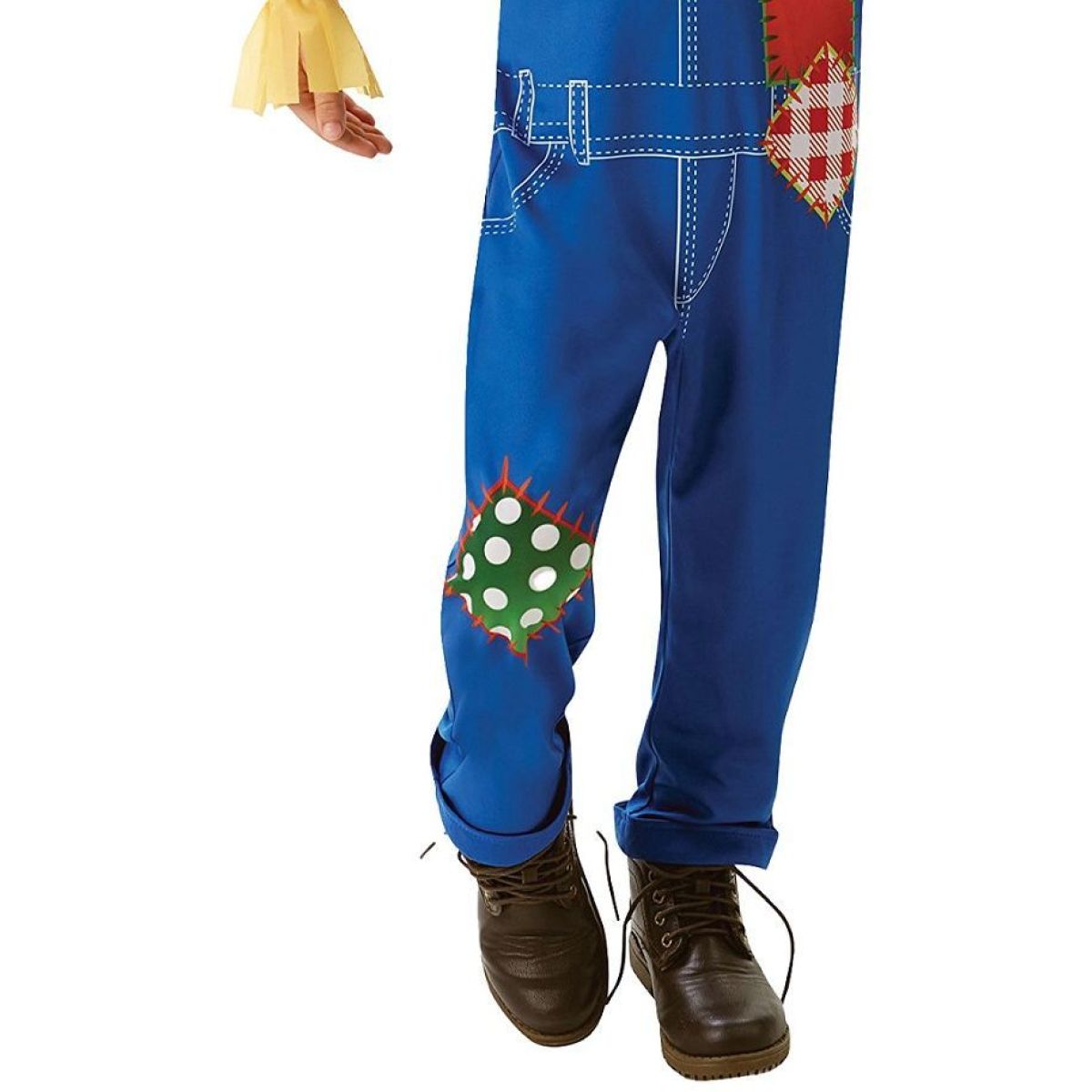 Dominantou kostýmu je pohodlná kombinéza v modrom odtieni s potlačou švov a vreciek, ktorá pôsobí ako skutočný pracovný odev strašiaka. Farebné záplaty a kockované rukávy dodávajú kostýmu hravosť a autentický vidiecky charakter. Žlté strapce okolo krku a na rukávoch pripomínajú slamu a podčiarkujú typický rozprávkový vzhľad strašiaka.