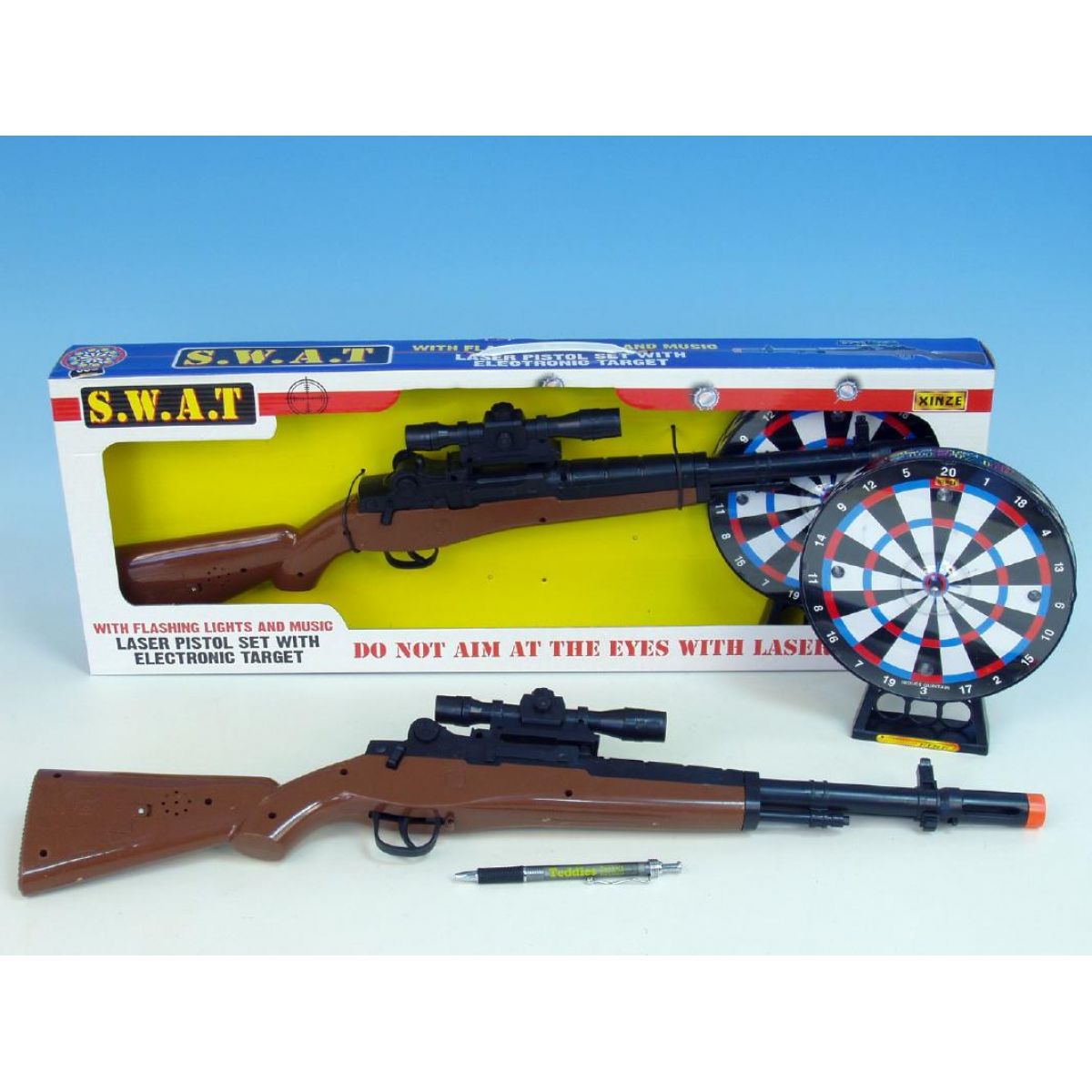 Laserová puška s laserem. Při zásahu terče laserem se terč rozehraje a rozbliká.