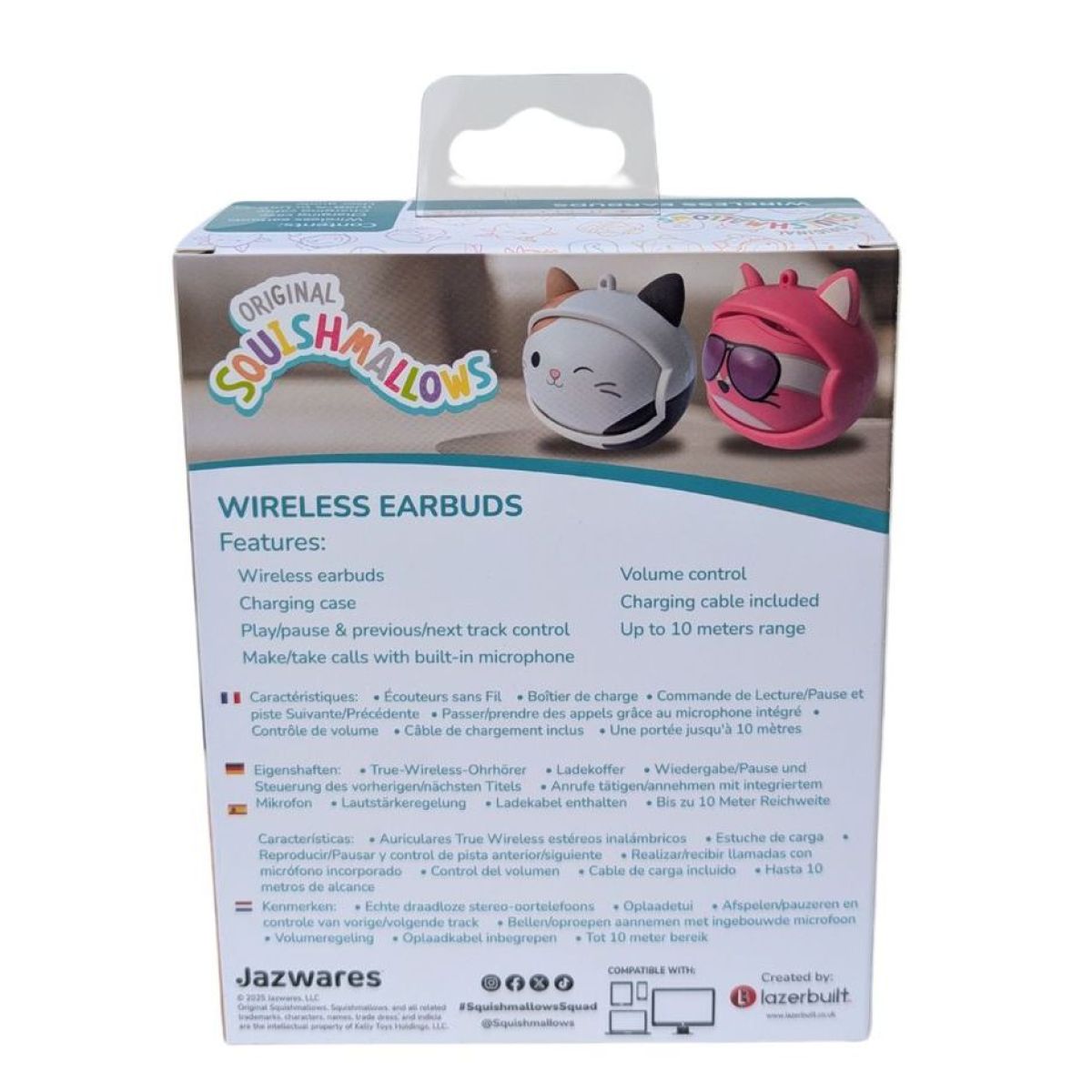 Bezdrôtové slúchadlá Lazerbuilt Squishmallows Face-change TWS Earbuds - Cam sú ideálne pre deti od 6 rokov, ktoré milujú hudbu aj zábavu. Nabíjacie puzdro dokáže meniť tváriku podľa nálady a zároveň bezpečne ukrýva slúchadlá pripravené na použitie. Vďaka technológii Bluetooth v5.0 sa ľahko pripojíte k zariadeniu a môžete si vychutnať obľúbené pesničky alebo prijímať hovory bez problémov. Dotykové ovládanie umožňuje jednoduché prehrávanie, pozastavenie či prepnutie skladby a nastavenie hlasitosti podľa potreby. Kvalitný zvuk spraví každý deň plný hier ešte veselším.