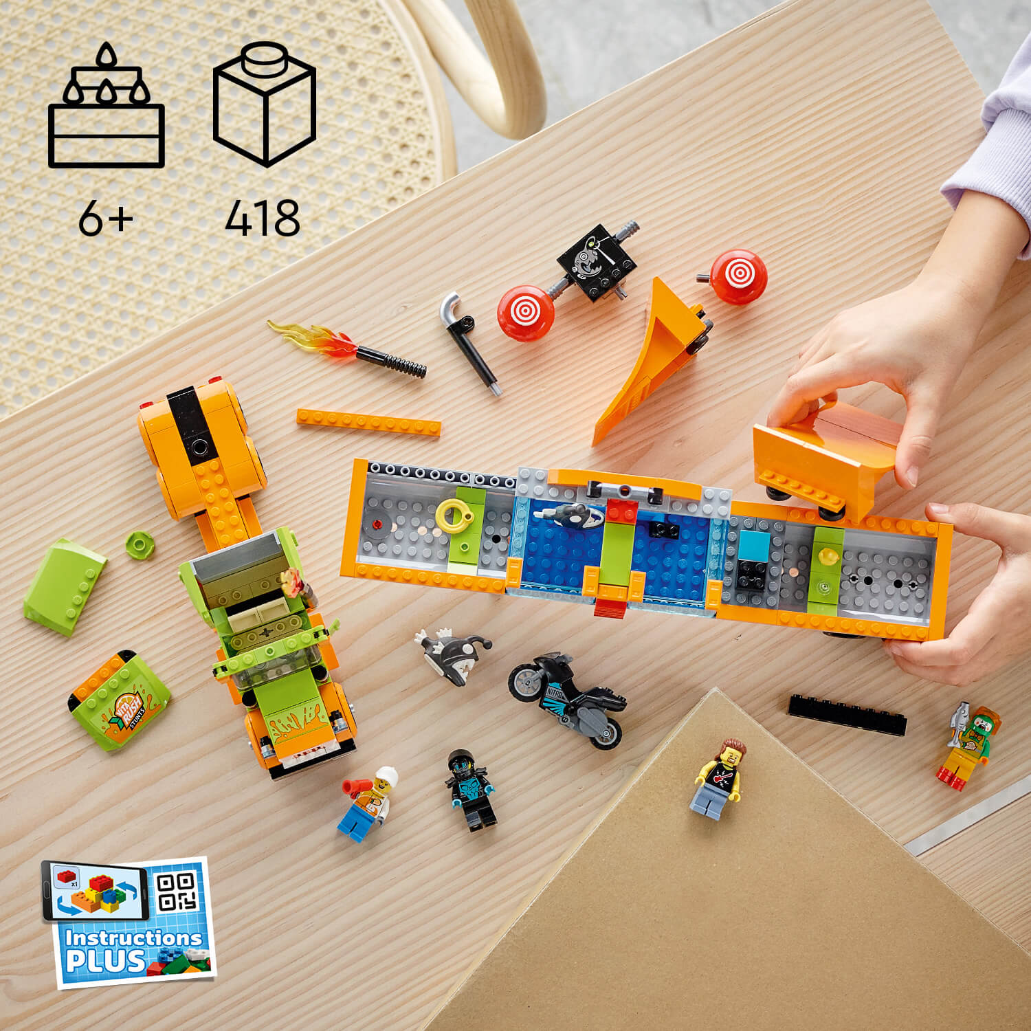 Potom sa môžu pustiť do akčných trikov s kamiónom a na motorke so zotrvačníkom. Budú mať pred sebou na zvládnutie vyzývavé prekážky, ako je kaskadérská nádrž. Po ich zvládnutí môžu modely prestavať. Digitálny sprievodca Instructions Plus, čo by zadarmo stiahnutelná aplikácia pre inteligentné telefóny a tablety, ponúka interaktívny návod. Prináša nástroje pre približovanie a otáčanie.