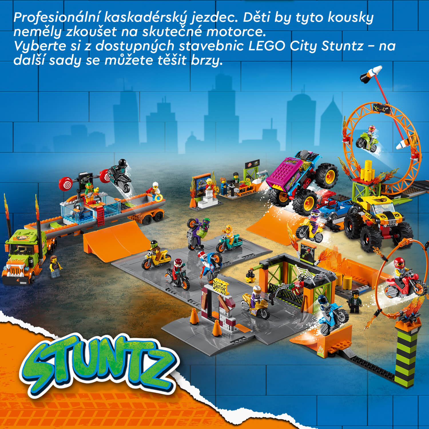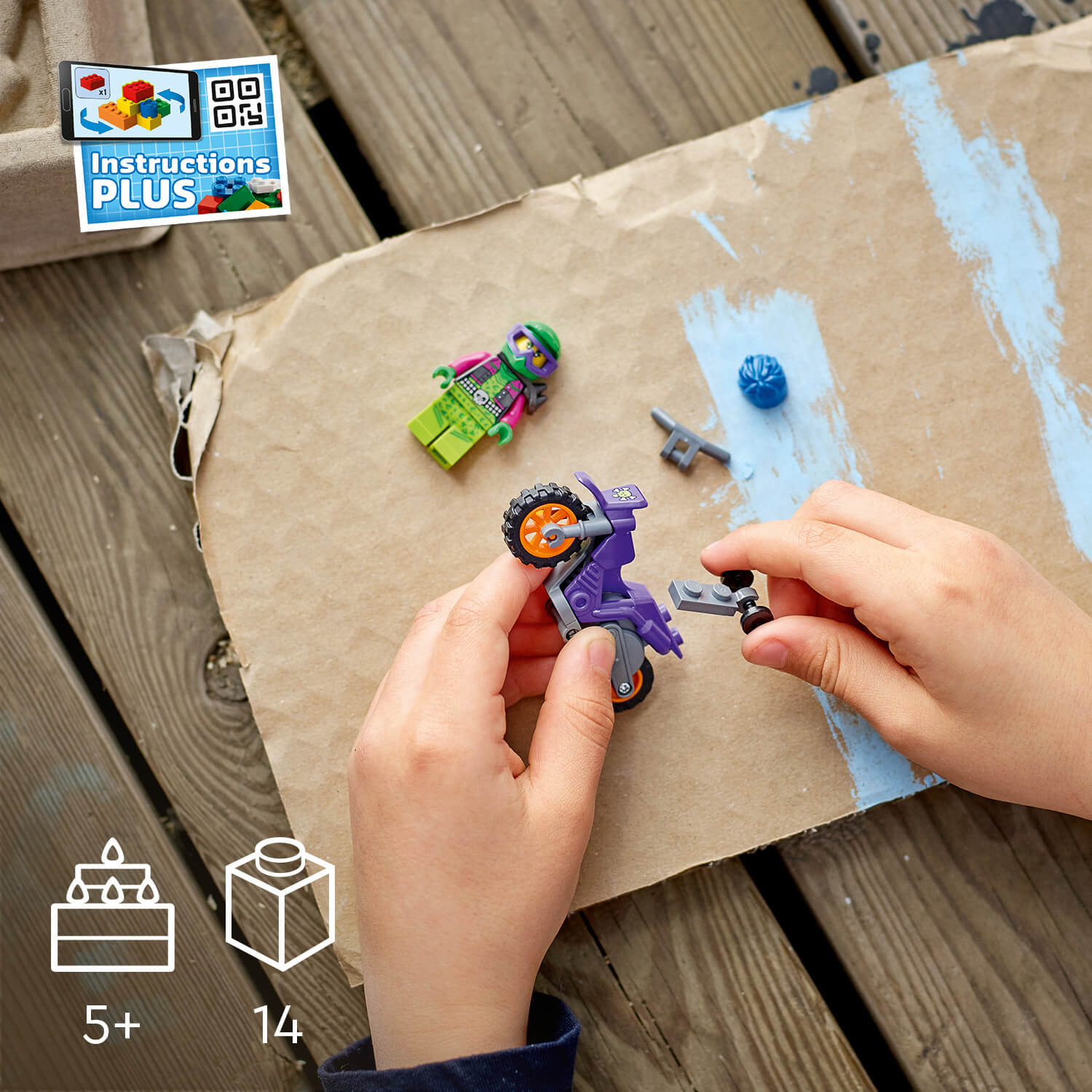 Kaskadérsku Wheelie motorku si môžu deti zostaviť zo 14 dielikov. Po zostavení si môžu prehrať príbeh, kedy si užijú s motorkou jazdy po jednom kole a predvedú kaskadérske kúsky vo vzduchu. Hlavnou aktérkou bude hviezda televízneho seriálu LEGO City Dobrodružstvo, kaskadérka Raza.