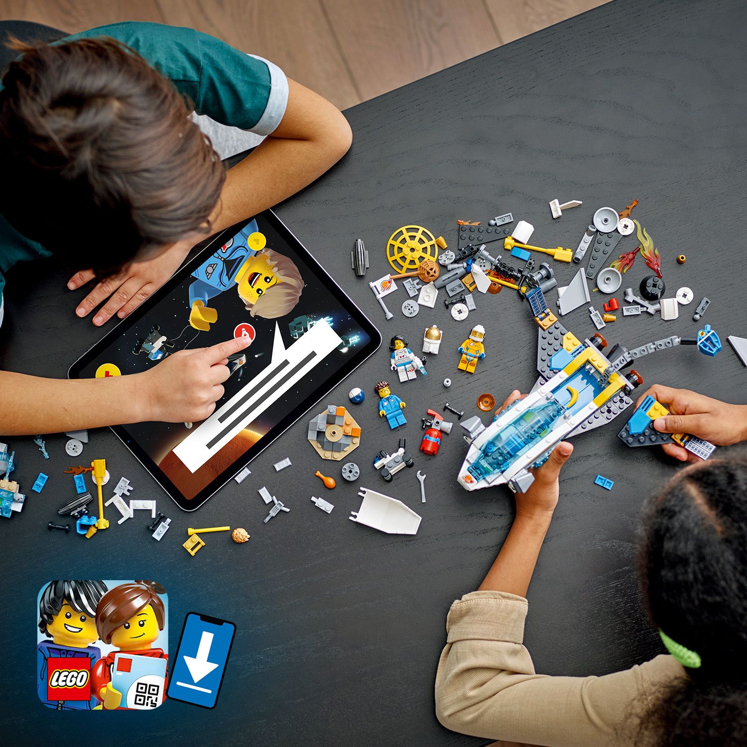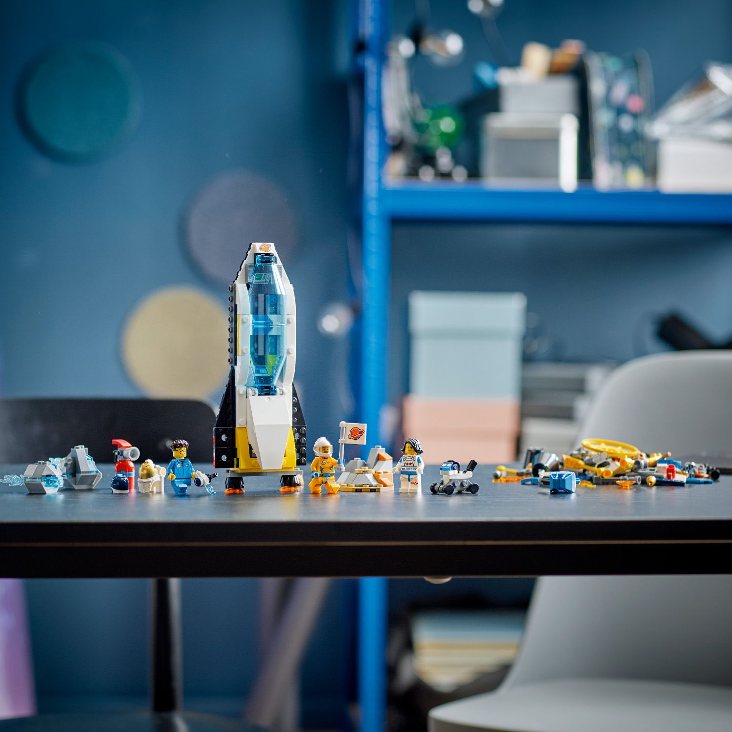 Kozmickú loď a prieskumné vesmírne vozidlo si môžu deti zostaviť z 298 dielikov. Potom si môžu prehrať príbeh vypustenia raketoplánu na obežnú dráhu.