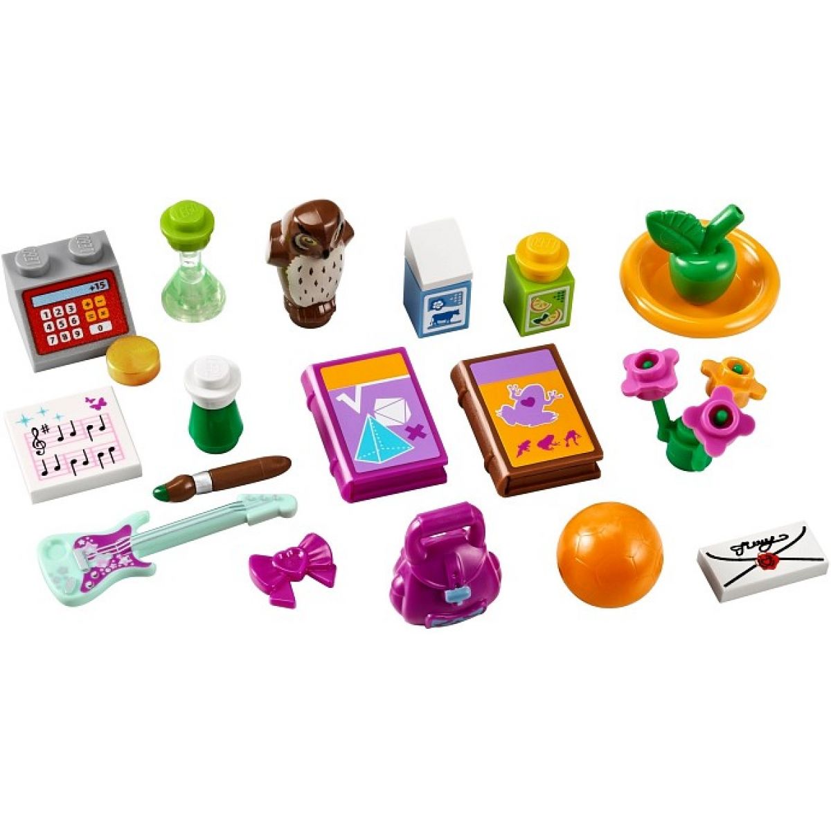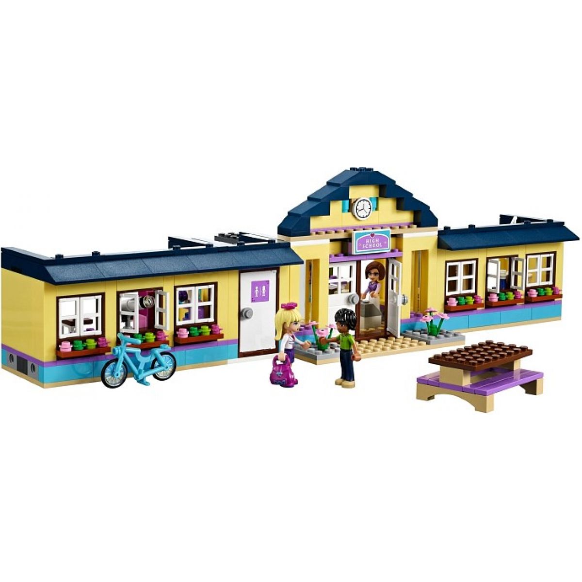 Prožij báječný den se Stephanií a Matthewem na střední škole v Heartlake. Jeď do školy na modrém kole Stephanie! Nejprve ulož její tašku a notebook do skříňky, pak se s ní vydej na hodinu přírodních věd, kde můžeš zkoumat rostlinné buňky pod mikroskopem, provádět chemické pokusy pomocí kádinek, nebo si vyzkoušet hvězdářský dalekohled. Jakmile tě při hodině biologie paní Stevensová vyzve k tabuli, ukaž své vědomosti a popiš jednotlivé části těla sovy! Pomoz Matthewovi najít hlavní města na mapě světa při hodině zeměpisu! Stephanie a Matthew si pak umyjí ruce a jdou na oběd. Vezmi si v jídelně pár sendvičů a džus a sněz si je na slunci u piknikového stolu. Po obědě je čas na trochu umění - nejprve s malířským stojanem při hodině výtvarné výchovy a poté s kytarou při hudební výchově. Po škole si zahraj basketbal s Matthewem nebo se jdi projet na kole! Obsahuje minifigurky-panenky Stephanie, Matthewa a paní Stevensové.